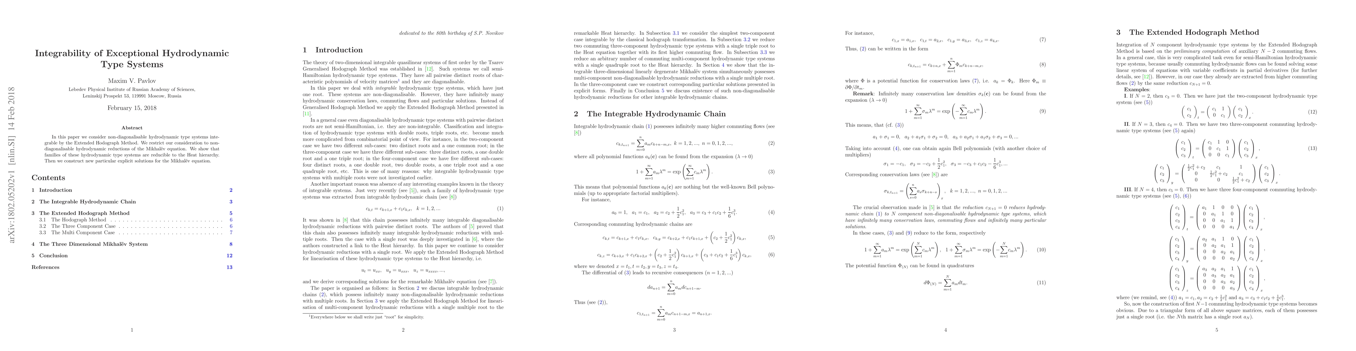 This paper explores non-diagonalisable hydrodynamic type systems, specifically reductions of the Mikhalev equation, which are shown to be integrable via the Extended Hodograph Method. It demonstrates their reduction to the Heat hierarchy and provides new explicit solutions for the Mikhalev equation.