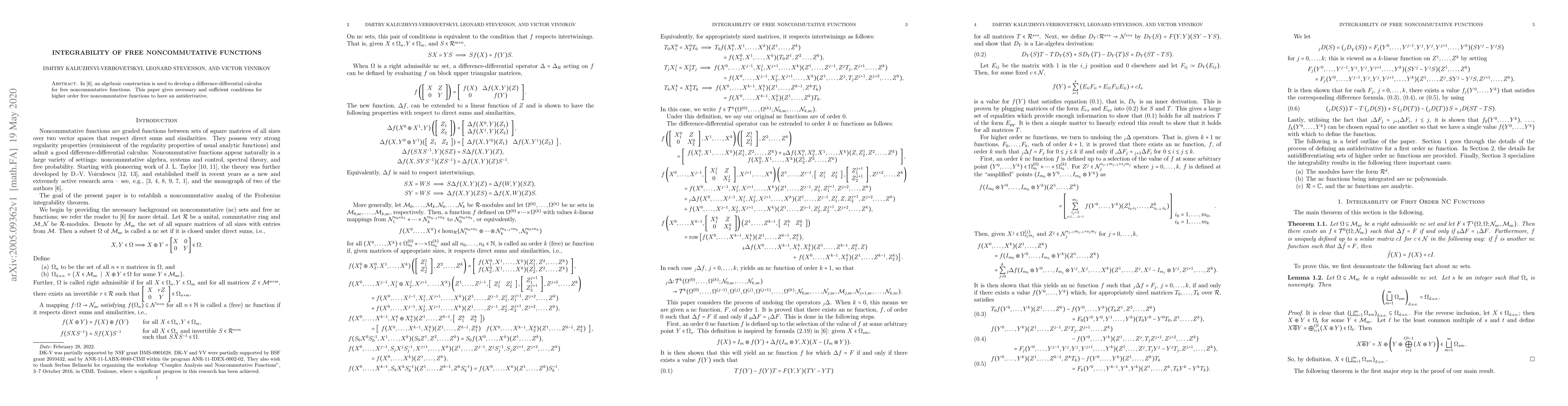 This paper explores the integrability of higher-order free noncommutative functions, establishing necessary and sufficient conditions for their existence of antiderivatives. It extends the Frobenius integrability theorem to this noncommutative setting, contributing to the growing field of free probability and noncommutative analysis.