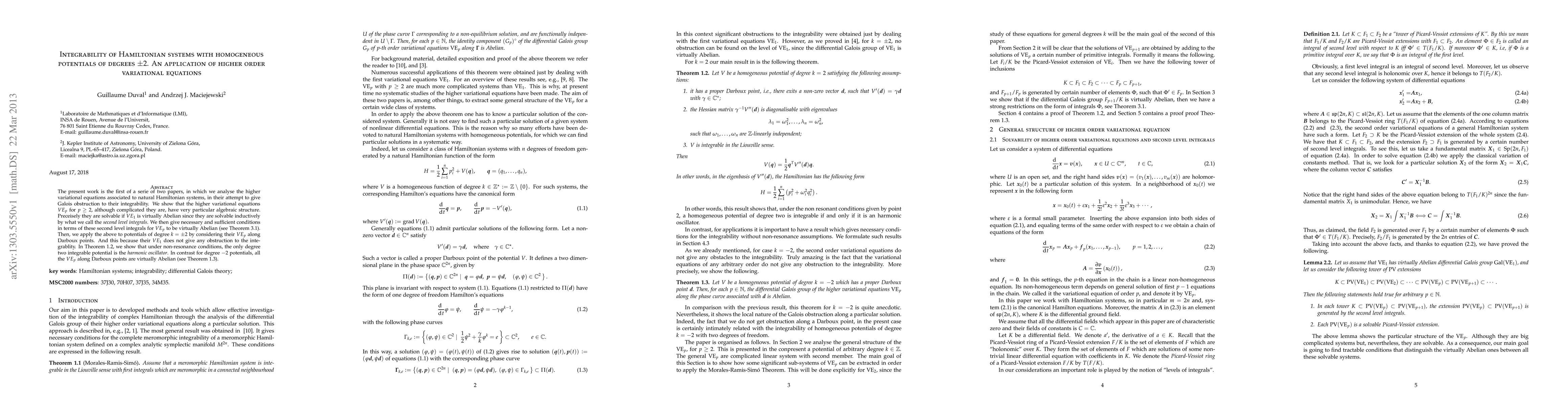 The present work is the first of a serie of two papers, in which we analyse the higher variational equations associated to natural Hamiltonian systems, in their attempt to give Galois obstruction to their integrability. We show that the higher variational equations $VE_{p}$ for $p\geq 2$, although complicated they are, have very particular algebraic structure. Preceisely they are solvable if $VE_{1}$ is virtually Abelian since they are solvable inductively by what we call the \emph{second level integrals}. We then give necessary and sufficient conditions in terms of these second level integrals for $VE_{p}$ to be virtually Abelian (see Theorem 3.1). Then, we apply the above to potentials of degree $k=\pm 2$ by considering their $VE_{p}$ along Darboux points. And this because their $VE_{1}$ does not give any obstruction to the integrablity. In Theorem 1.2, we show that under non-resonance conditions, the only degree two integrable potential is the \emph{harmonic oscillator}. In contrast for degree -2 potentials, all the $VE_{p}$ along Darboux points are virtually Abelian (see Theorem 1.3)
