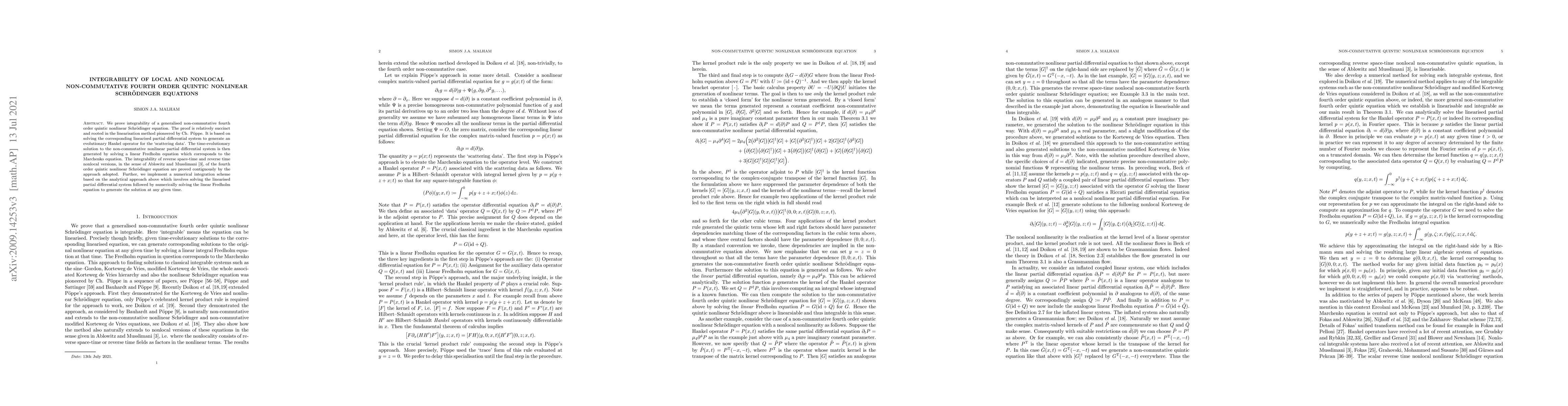 This paper proves the integrability of a generalised non-commutative fourth order quintic nonlinear Schrödinger equation using a linearisation method, generating an evolutionary Hankel operator for scattering data. It also extends the proof to nonlocal versions and implements a numerical integration scheme based on the analytical approach.