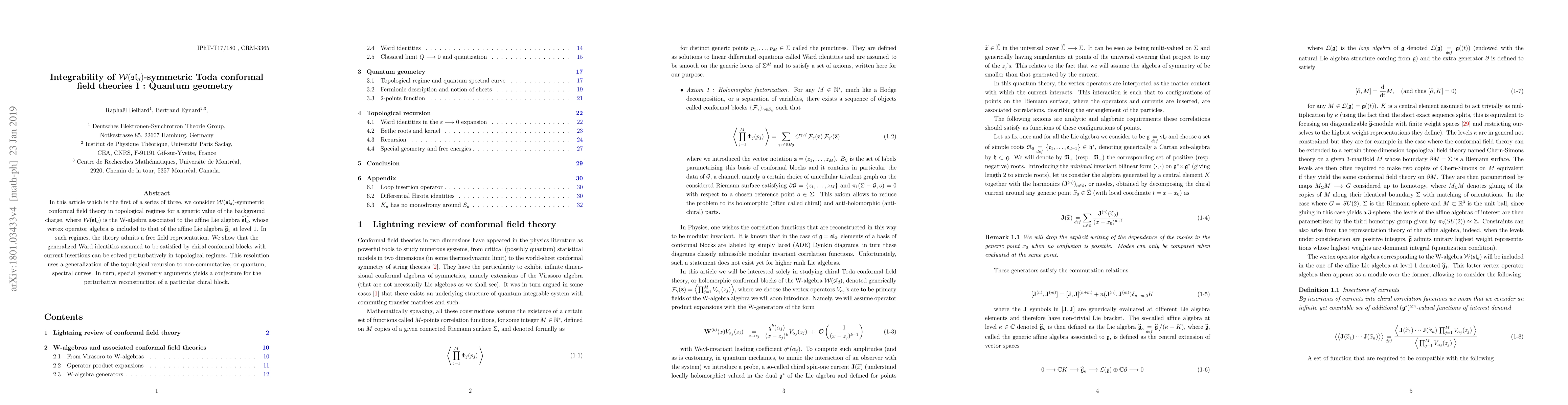 This paper explores the integrability of $\mathcal W({\mathfrak{sl}_d})$-symmetric Toda conformal field theories in topological regimes, demonstrating that generalized Ward identities can be solved perturbatively using a topological recursion on quantum spectral curves. It conjectures a method for reconstructing a particular chiral block through special geometry arguments.