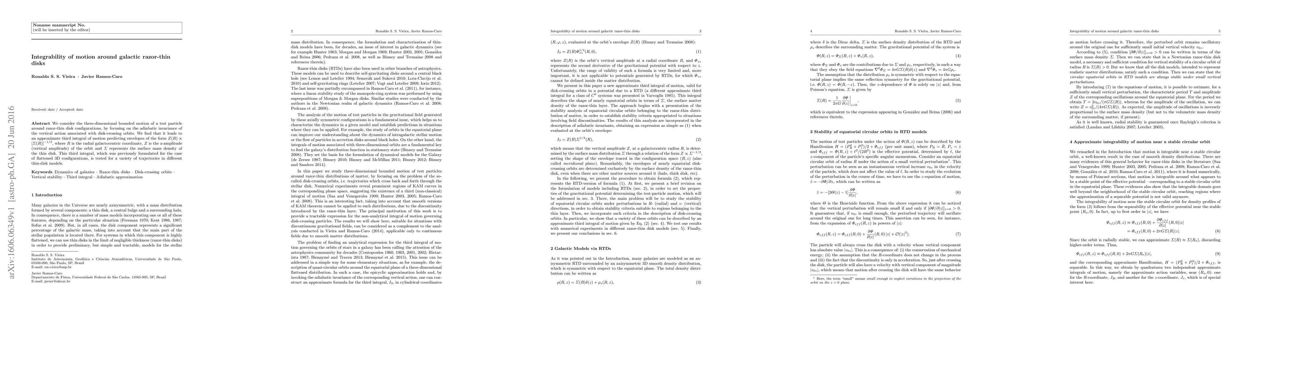 This paper investigates the three-dimensional motion of test particles around razor-thin galactic disks, revealing an adiabatic invariance that results in an approximate third integral of motion. This integral predicts vertical amplitude envelopes proportional to the inverse cube root of the surface mass density.