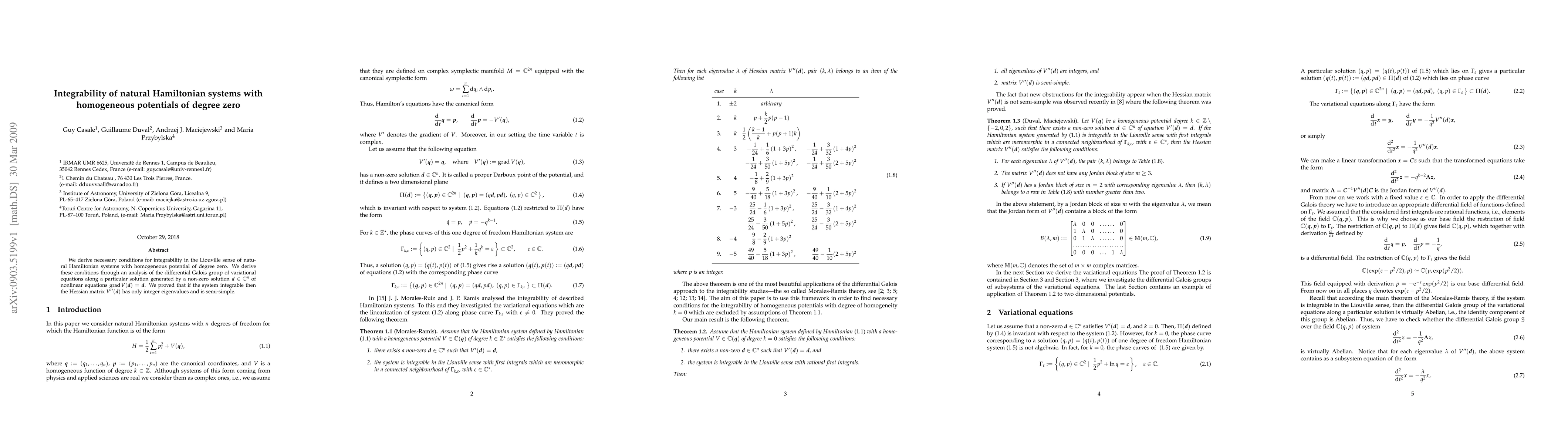 Summary: This paper establishes conditions for the integrability of natural Hamiltonian systems with degree zero homogeneous potentials, showing that integrability requires the Hessian matrix of the potential to have only integer eigenvalues and to be semi-simple. The analysis leverages the differential Galois group of variational equations.