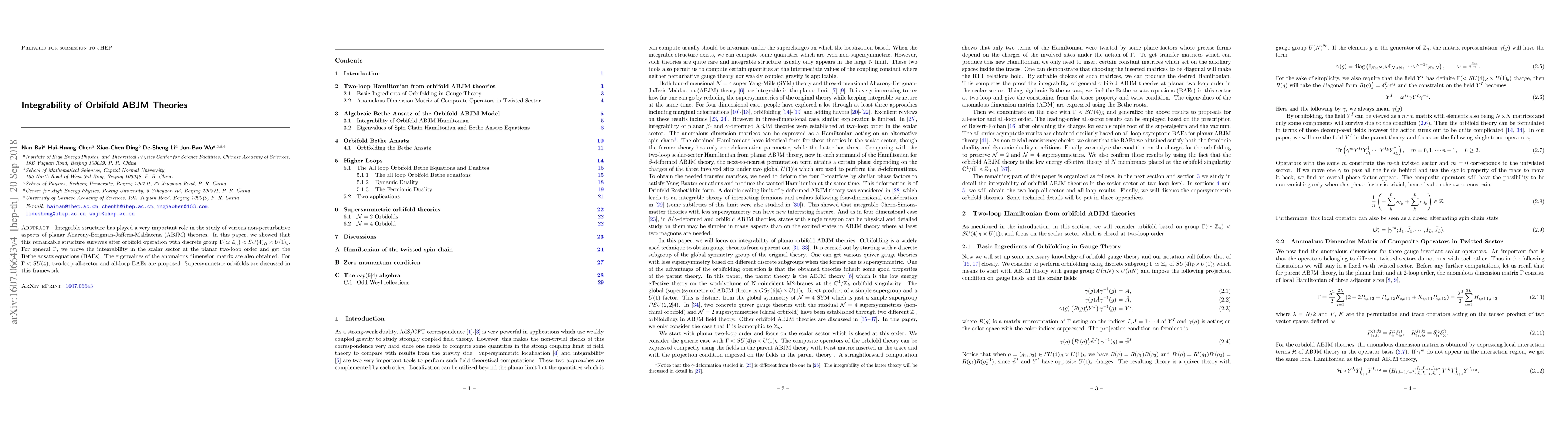 This paper demonstrates that the integrable structure of planar ABJM theories persists after orbifolding with a discrete group $\Gamma(\simeq\mathbb{Z}_n)$ within $SU(4)_R \times U(1)_b$. The authors prove integrability in the scalar sector at the planar two-loop order, derive Bethe ansatz equations, and determine eigenvalues of the anomalous dimension matrix, extending to all-sector and all-loop equations for $\Gamma < SU(4)$.
