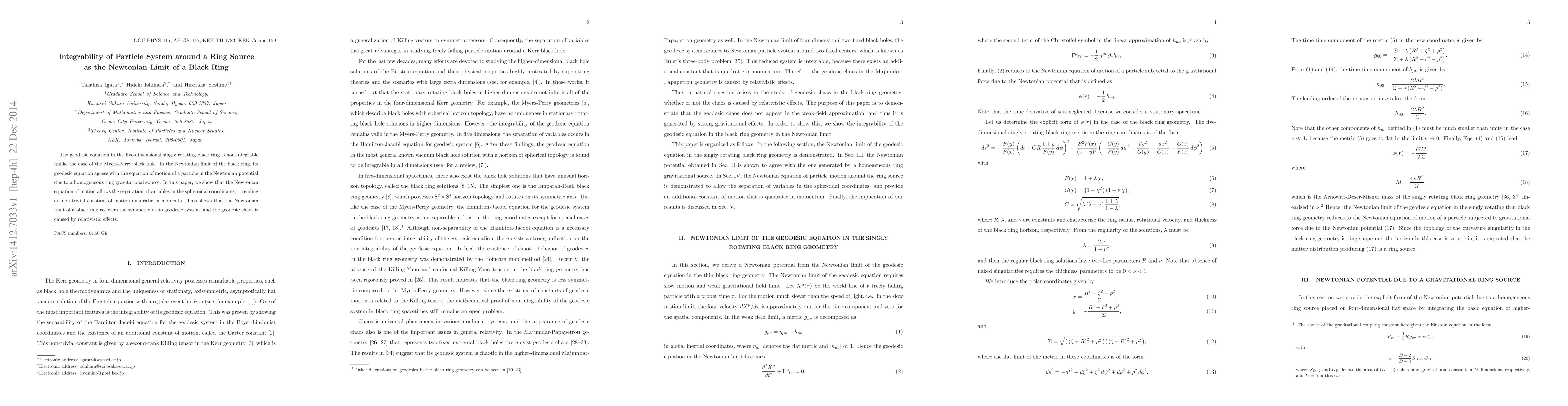 This paper demonstrates that the geodesic equation of a five-dimensional black ring is non-integrable, unlike the Myers-Perry black hole. In the Newtonian limit, the black ring's geodesic equation aligns with the motion of a particle around a ring source, revealing a non-trivial constant of motion and indicating that geodesic chaos arises from relativistic effects.