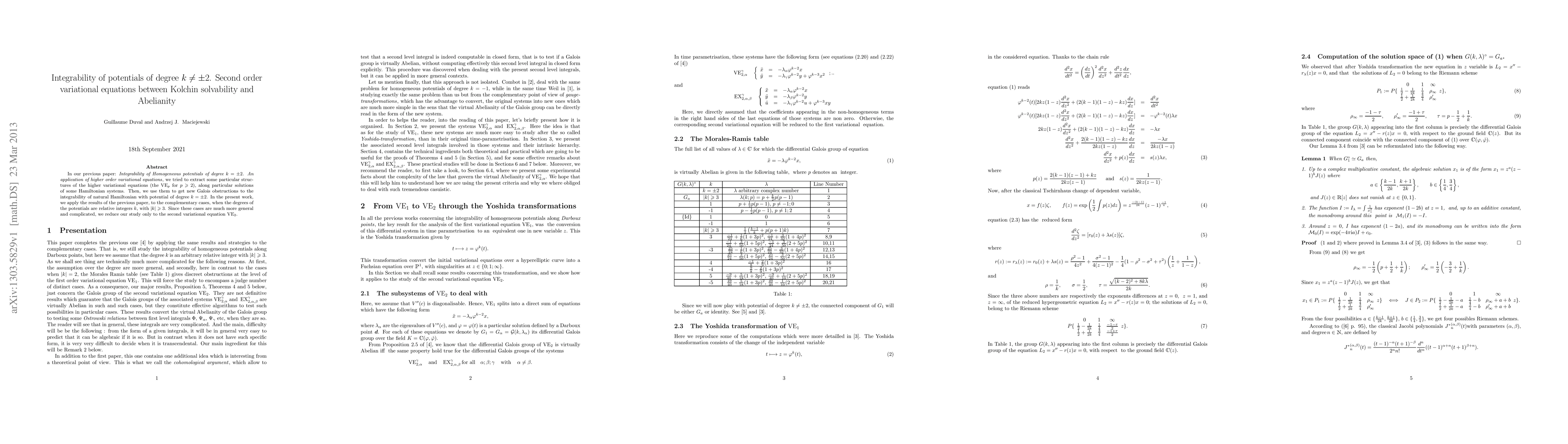 In our previous paper: Integrability of Homogeneous potentials of degree $k = \pm 2$. An application of higher order variational equations, we tried to extract some particular structures of the higher variational equations (the ${VE}_p$ for $p >1 $), along particular solutions of some Hamiltonian systems. Then, we use them to get new Galois obstructions to the integrability of natural Hamiltonian with potential of degree $k = \pm 2$. In the present work, we apply the results of the previous paper, to the complementary cases, when the degrees of the potentials are relative integers $k$, with $|k| >2$. Since these cases are much more general and complicated, we reduce our study only to the second variational equation ${VE}_2$.