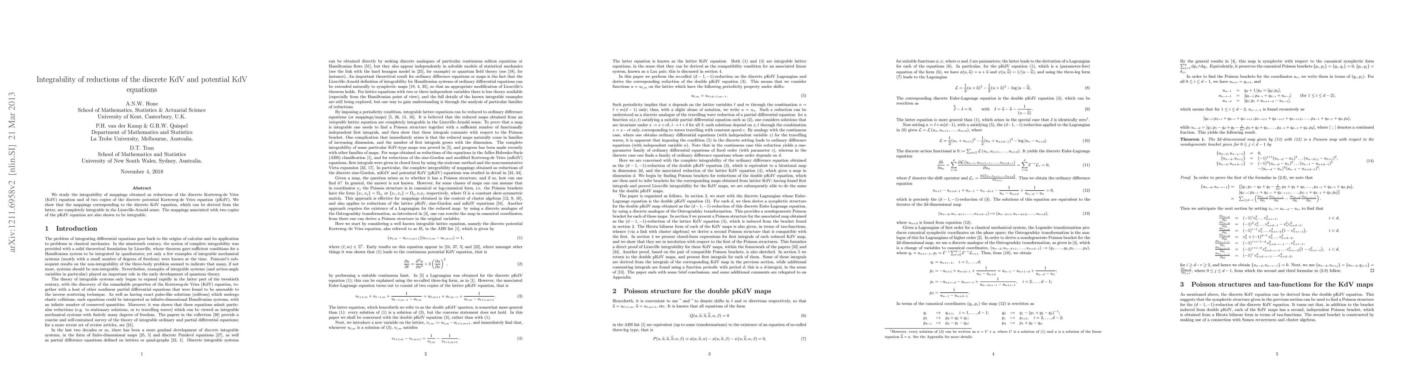 This paper investigates the integrability of reductions derived from the discrete KdV and potential KdV equations, demonstrating that the reductions from the discrete KdV equation are completely integrable, and those from two copies of the discrete potential KdV equation are also integrable.