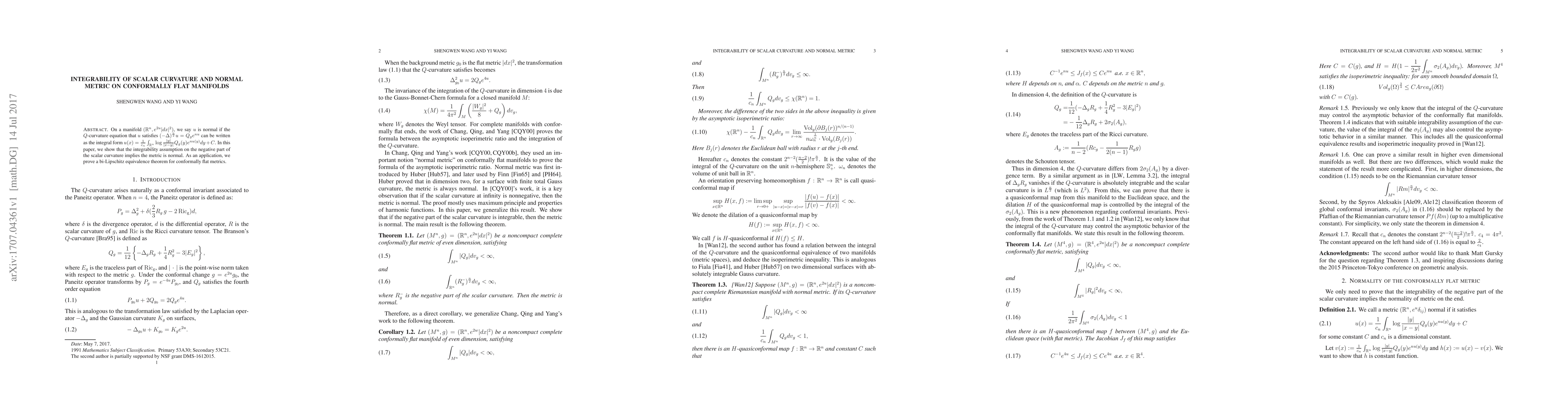 On a manifold $(\mathbb{R}^n, e^{2u} |dx|^2)$, we say $u$ is normal if the $Q$-curvature equation that $u$ satisfies $(-\Delta)^{\frac{n}{2}} u = Q_g e^{nu}$ can be written as the integral form $u(x)=\frac{1}{c_n}\int_{\mathbb R^n}\log\frac{|y|}{|x-y|}Q_g(y)e^{nu(y)}dy+C$. In this paper, we show that the integrability assumption on the negative part of the scalar curvature implies the metric is normal. As an application, we prove a bi-Lipschitz equivalence theorem for conformally flat metrics.