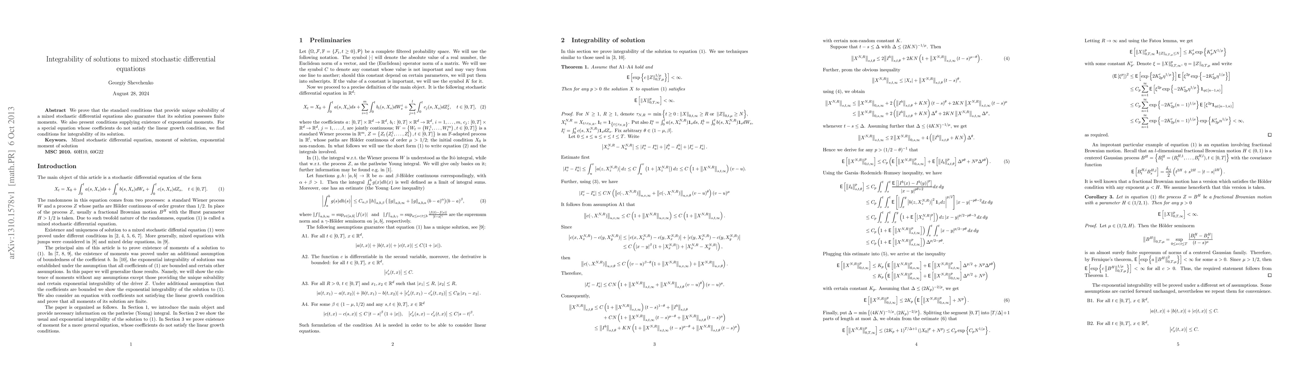 This paper proves that standard conditions ensuring unique solvability for mixed stochastic differential equations also guarantee finite moments for the solution. It further presents conditions for the existence of exponential moments and identifies integrability conditions for a special case where the coefficients do not meet the linear growth condition.