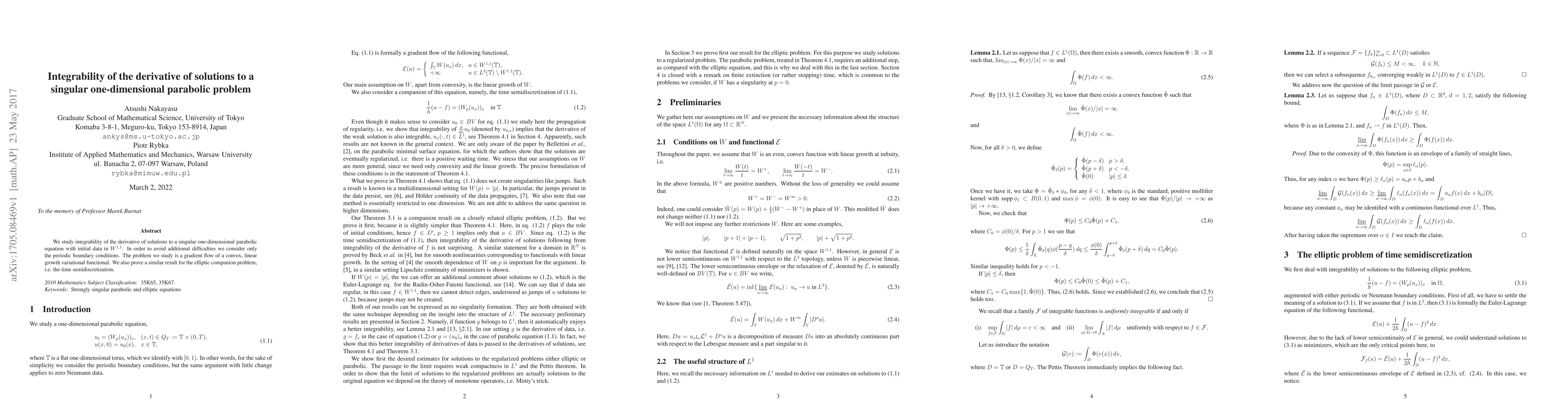 This paper explores the integrability of the derivative of solutions to a singular one-dimensional parabolic equation with periodic boundary conditions, focusing on initial data in $W^{1,1}$. It also proves a corresponding result for the elliptic companion problem through time semidiscretization.