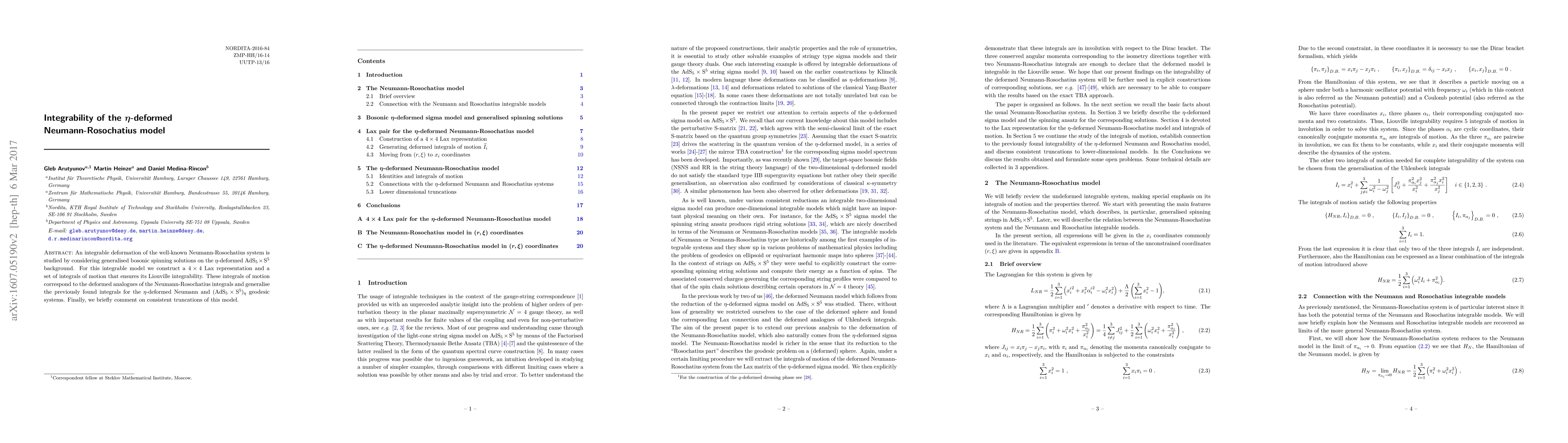 An integrable deformation of the well-known Neumann-Rosochatius system is studied by considering generalised bosonic spinning solutions on the eta-deformed AdS_5 x S^5 background. For this integrable model we construct a 4x4 Lax representation and a set of integrals of motion that ensures its Liouville integrability. These integrals of motion correspond to the deformed analogues of the Neumann-Rosochatius integrals and generalise the previously found integrals for the eta-deformed Neumann and (AdS_5 x S^5)_eta geodesic systems. Finally, we briefly comment on consistent truncations of this model.