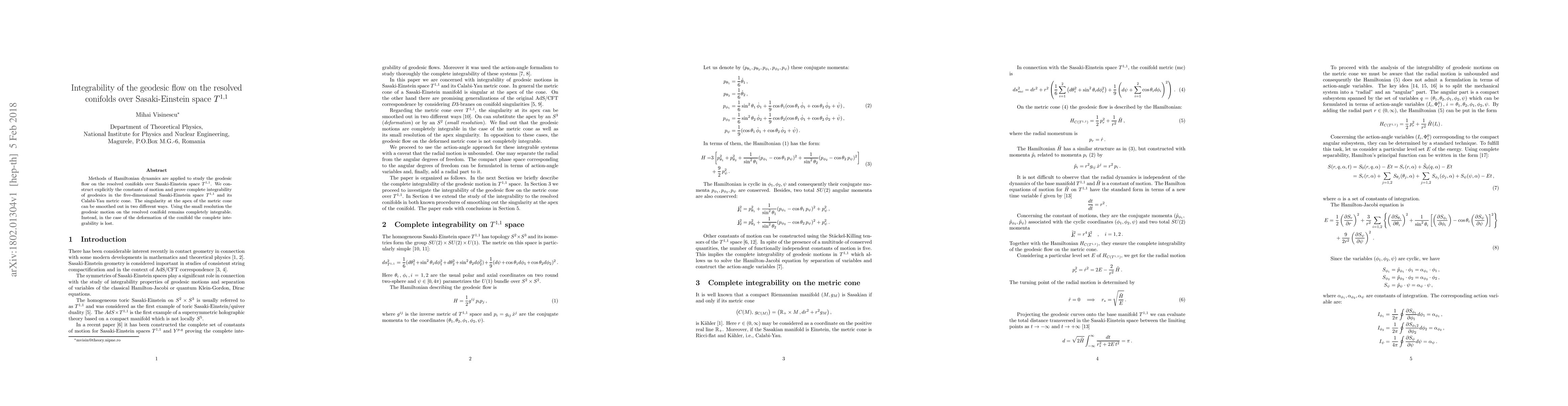 Methods of Hamiltonian dynamics are applied to study the geodesic flow on the resolved conifolds over Sasaki-Einstein space $T^{1,1}$. We construct explicitly the constants of motion and prove complete integrability of geodesics in the five-dimensional Sasaki-Einstein space $T^{1,1}$ and its Calabi-Yau metric cone. The singularity at the apex of the metric cone can be smoothed out in two different ways. Using the small resolution the geodesic motion on the resolved conifold remains completely integrable. Instead, in the case of the deformation of the conifold the complete integrability is lost.