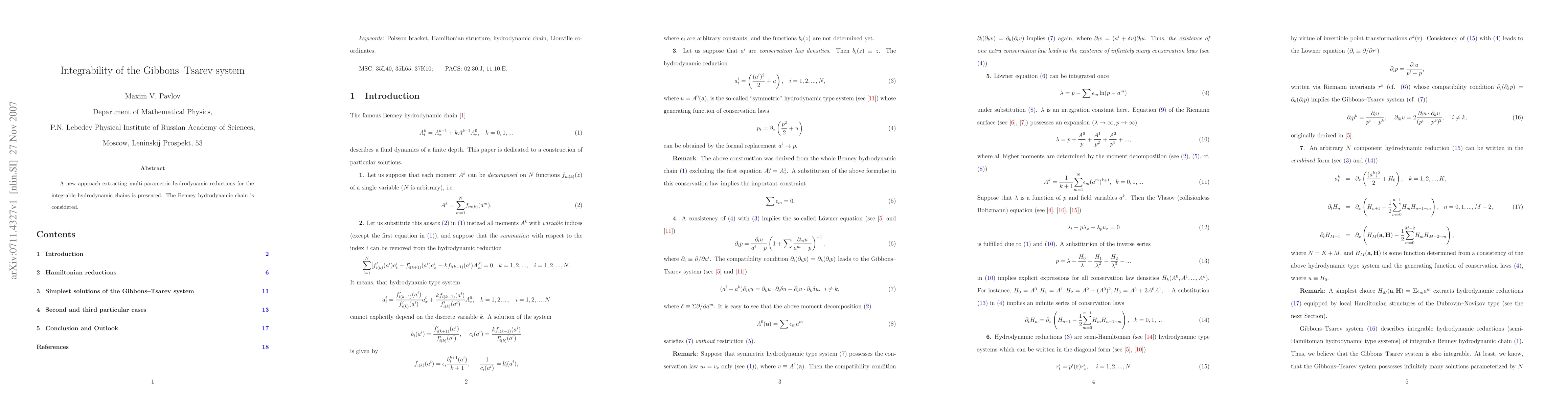 A new approach extracting multi-parametric hydrodynamic reductions for the integrable hydrodynamic chains is presented. The Benney hydrodynamic chain is considered.