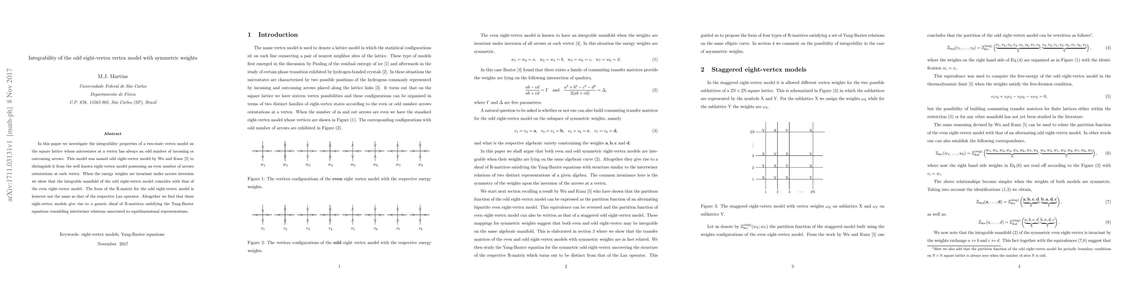 In this paper we investigate the integrability properties of a two-state vertex model on the square lattice whose microstates at a vertex has always an odd number of incoming or outcoming arrows. This model was named odd eight-vertex model by Wu and Kunz \cite{WK} to distinguish it from the well known eight-vertex model possessing an even number of arrows orientations at each vertex. When the energy weights are invariant under arrows inversion we show that the integrable manifold of the odd eight-vertex model coincides with that of the even eight-vertex model. The form of the $\mathrm{R}$-matrix for the odd eight-vertex model is however not the same as that of the respective Lax operator. Altogether we find that these eight-vertex models give rise to a generic sheaf of $\mathrm{R}$-matrices satisfying the Yang-Baxter equations resembling intertwiner relations associated to equidimensional representations.