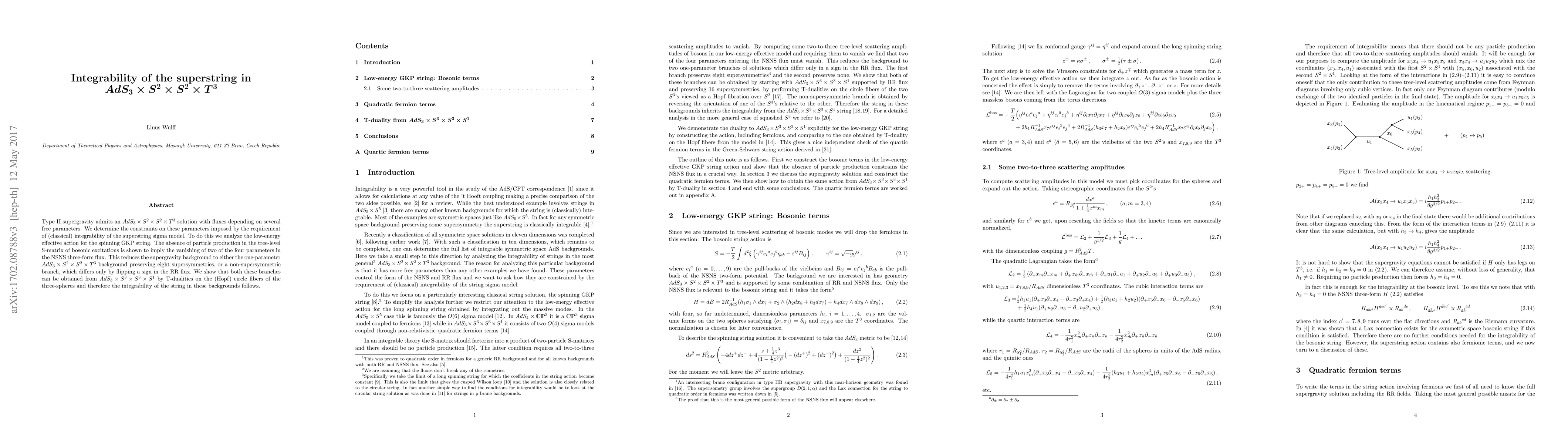 This research investigates the integrability of the superstring in a specific Type II supergravity background with an AdS(3) x S(2) x S(2) x T(3) geometry. The study finds that the vanishing of two parameters in the NSNS three-form flux due to the absence of particle production implies the background's reduction to either a supersymmetric one-parameter solution or a non-supersymmetric variant, both of which can be derived via T-dualities.