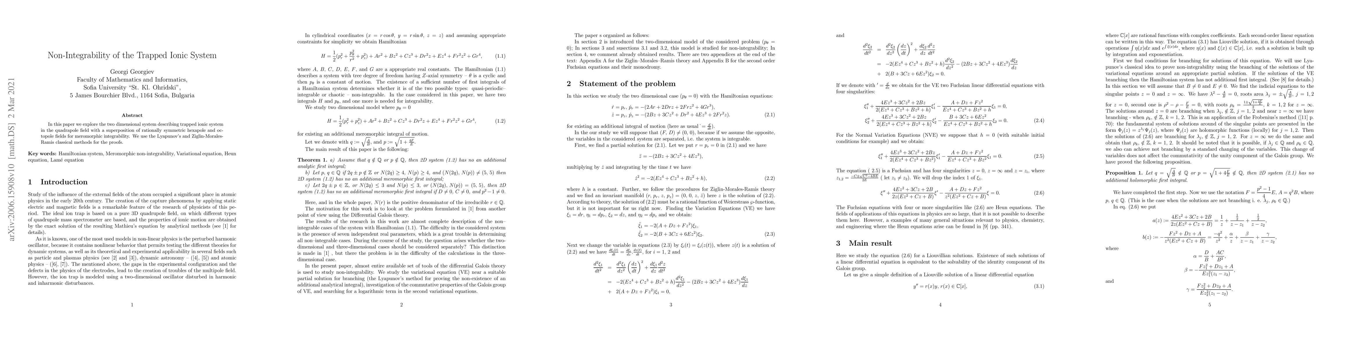 This paper explores the integrability of a 2D system describing trapped ionic systems with specific magnetic field configurations using classical methods from the theory of transcendental numbers. The study focuses on the monodromy group of the normal variational equation for commutativity.
