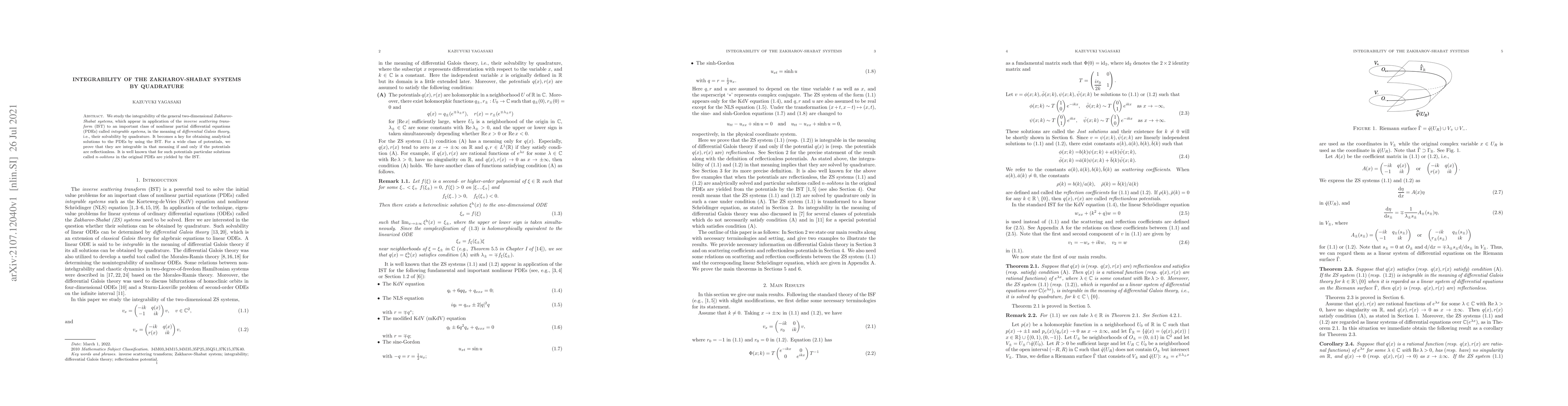 We study the integrability of the general two-dimensional Zakharov-Shabat systems, which appear in application of the inverse scattering transform (IST) to an important class of nonlinear partial differential equations (PDEs) called integrable systems, in the meaning of differential Galois theory, i.e., their solvability by quadrature. It becomes a key for obtaining analytical solutions to the PDEs by using the IST. For a wide class of potentials, we prove that they are integrable in that meaning if and only if the potentials are reflectionless. It is well known that for such potentials particular solutions called n-solitons in the original PDEs are yielded by the IST.