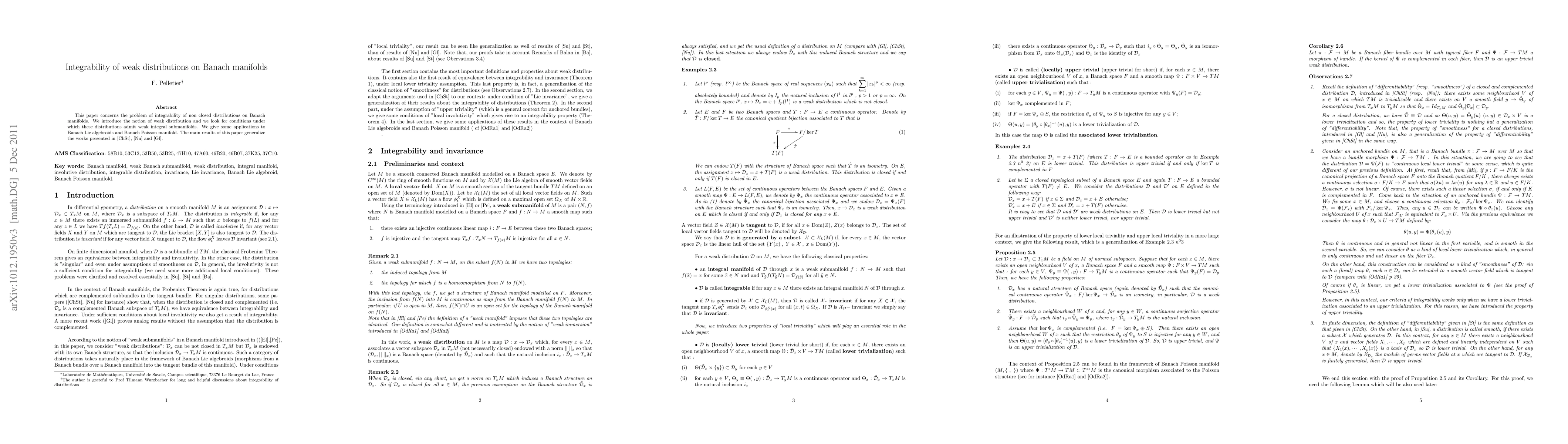 This paper investigates the integrability of non-closed distributions on Banach manifolds, introducing weak distributions and conditions for their weak integral submanifolds. It generalizes previous results and applies findings to Banach Lie algebroid and Banach Lie-Poisson manifolds.