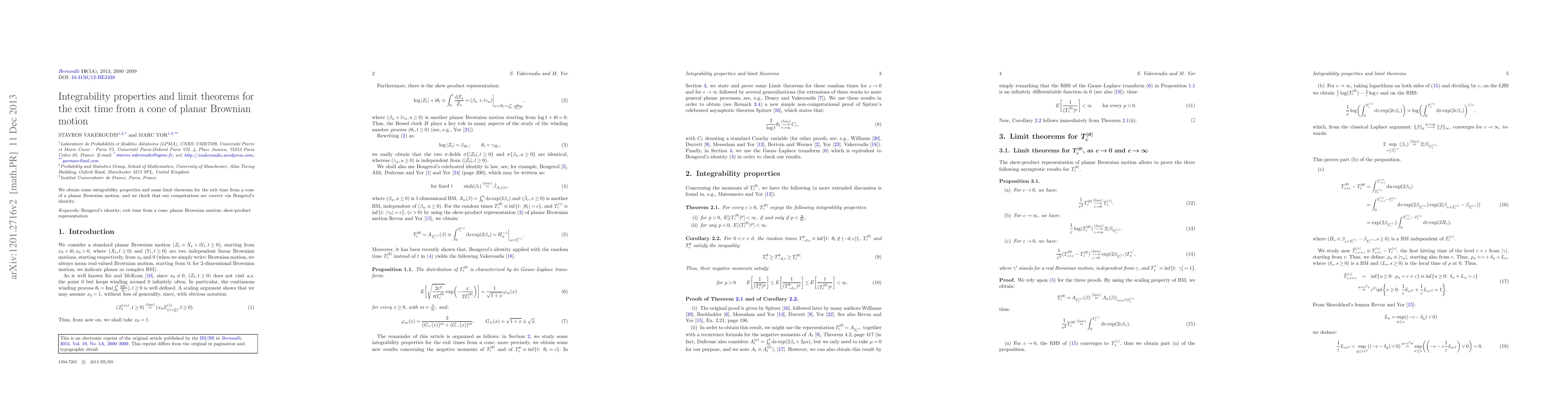 Summary: This paper investigates the integrability properties and limit theorems for the exit time of planar Brownian motion from a cone, using Bougerol's identity to validate the computations. The findings provide insights into the probabilistic behavior of Brownian motion near conical boundaries.