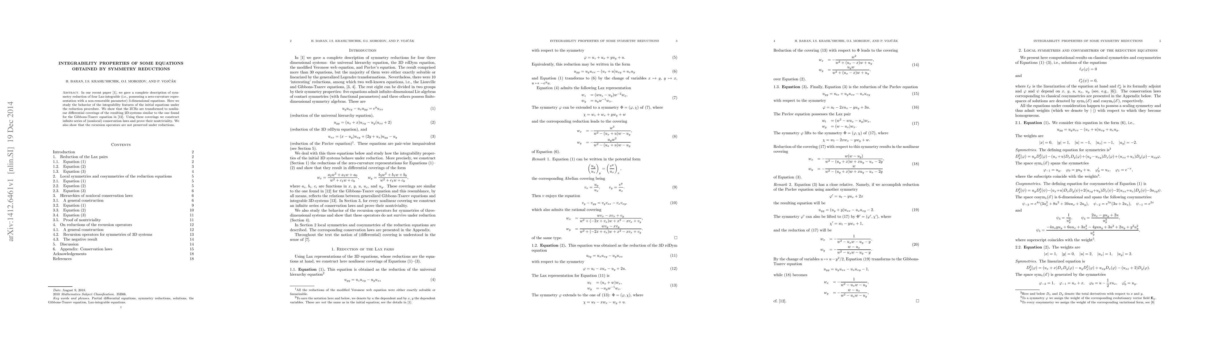 In our recent paper [H. Baran, I.S. Krasil'shchik, O.I. Morozov, P. Voj{\v{c}}{\'{a}}k, Symmetry reductions and exact solutions of Lax integrable $3$-dimensional systems, Journal of Nonlinear Mathematical Physics, Vol. 21, No. 4 (December 2014), 643--671; arXiv:1407.0246 [nlin.SI], DOI: 10.1080/14029251.2014.975532}], we gave a complete description of symmetry reduction of four Lax-integrable (i.e., possessing a zero-curvature representation with a non-removable parameter) $3$-dimensional equations. Here we study the behavior of the integrability features of the initial equations under the reduction procedure. We show that the ZCRs are transformed to nonlinear differential coverings of the resulting 2D-systems similar to the one found for the Gibbons-Tsarev equation in [A.V. Odesskii, V.V. Sokolov, Non-homogeneous systems of hydrodynamic type possessing Lax representations, arXiv:1206.5230, 2006]. Using these coverings we construct infinite series of (nonlocal) conservation laws and prove their nontriviality. We also show that the recursion operators are not preserved under reductions.