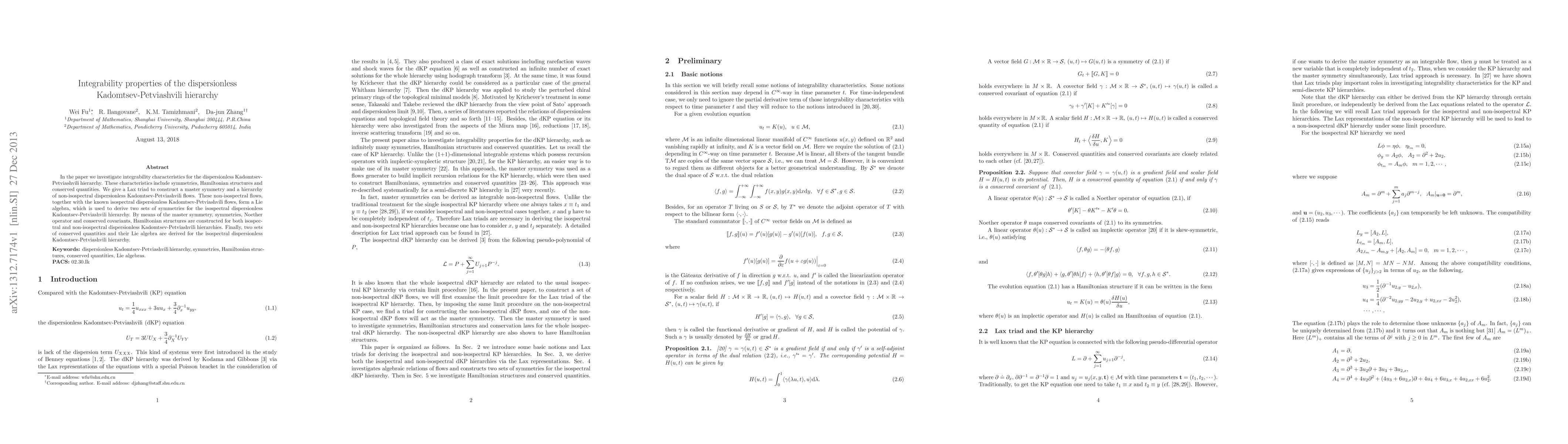 This paper explores the integrability properties of the dispersionless Kadomtsev-Petviashvili hierarchy, detailing symmetries, Hamiltonian structures, and conserved quantities. It constructs a Lax triad to derive a master symmetry and a hierarchy of non-isospectral flows, forming a Lie algebra that underpins the derivation of symmetries and conserved quantities for the hierarchy.