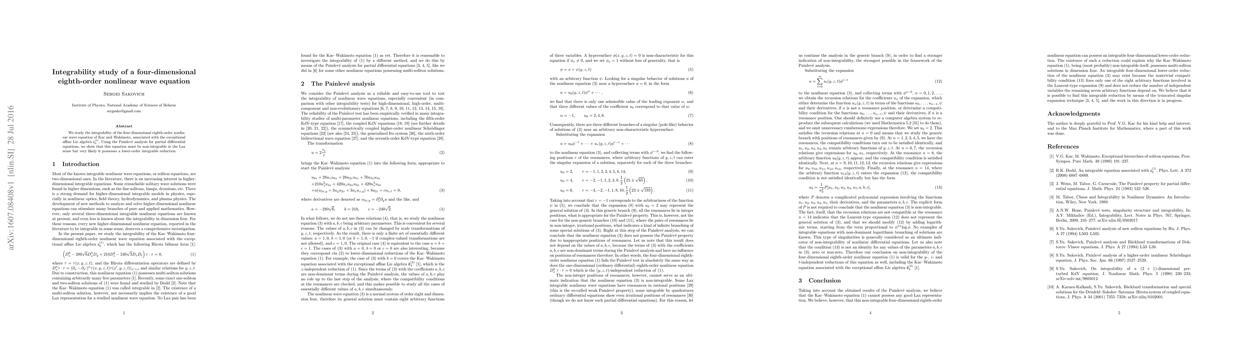 We study the integrability of the four-dimensional eighth-order nonlinear wave equation of Kac and Wakimoto, associated with the exceptional affine Lie algebra ${\mathfrak e}_6^{(1)}$. Using the Painlev\'{e} analysis for partial differential equations, we show that this equation must be non-integrable in the Lax sense but very likely it possesses a lower-order integrable reduction.