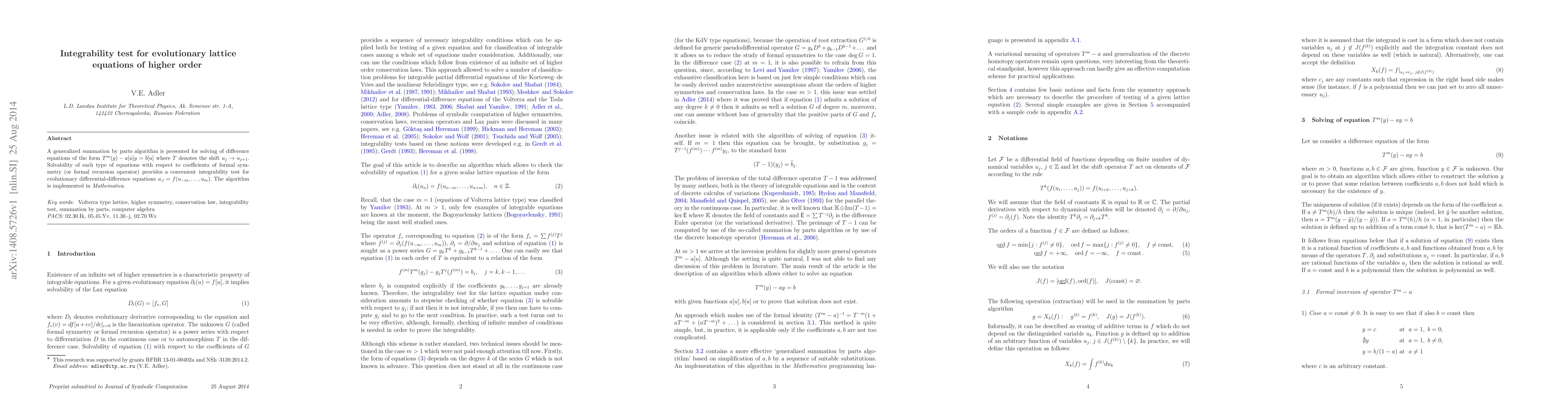 A generalized summation by parts algorithm is presented for solving of difference equations of the form $T^m(y)-a[u]y=b[u]$ where $T$ denotes the shift $u_j\to u_{j+1}$. Solvability of such type of equations with respect to coefficients of formal symmetry (or formal recursion operator) provides a convenient integrability test for evolutionary differential-difference equations $u_{,t}=f(u_{-m},\dots,u_m)$. The algorithm is implemented in {\em Mathematica}.