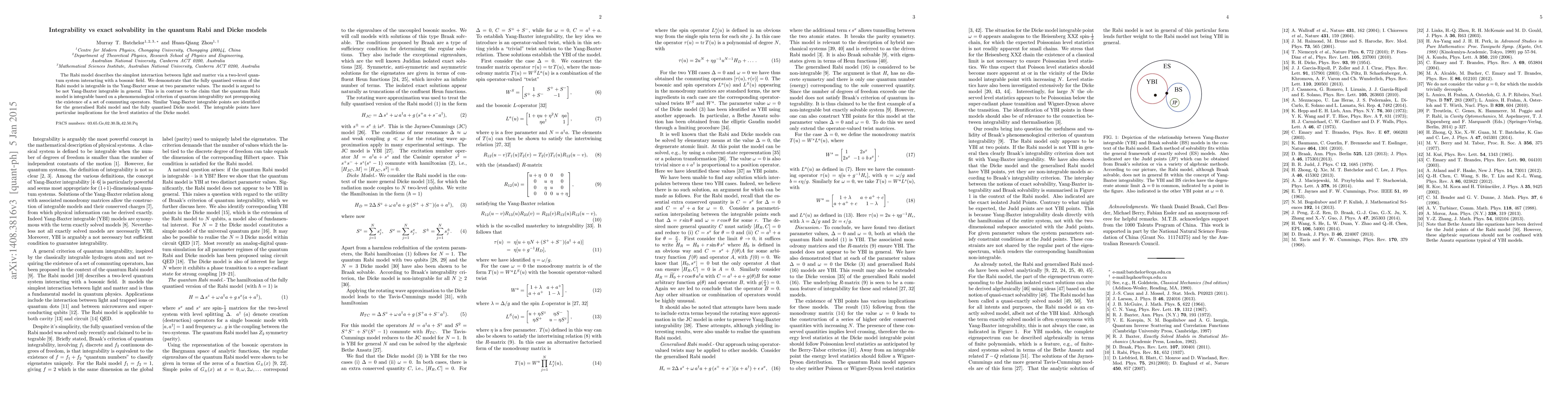 The paper demonstrates that the fully quantised Rabi model is integrable at specific parameter values but not generally, contrasting with previous claims based on a phenomenological criterion. Similar findings are made for the generalised Rabi model and the Dicke model, with implications for the level statistics of the Dicke model.
