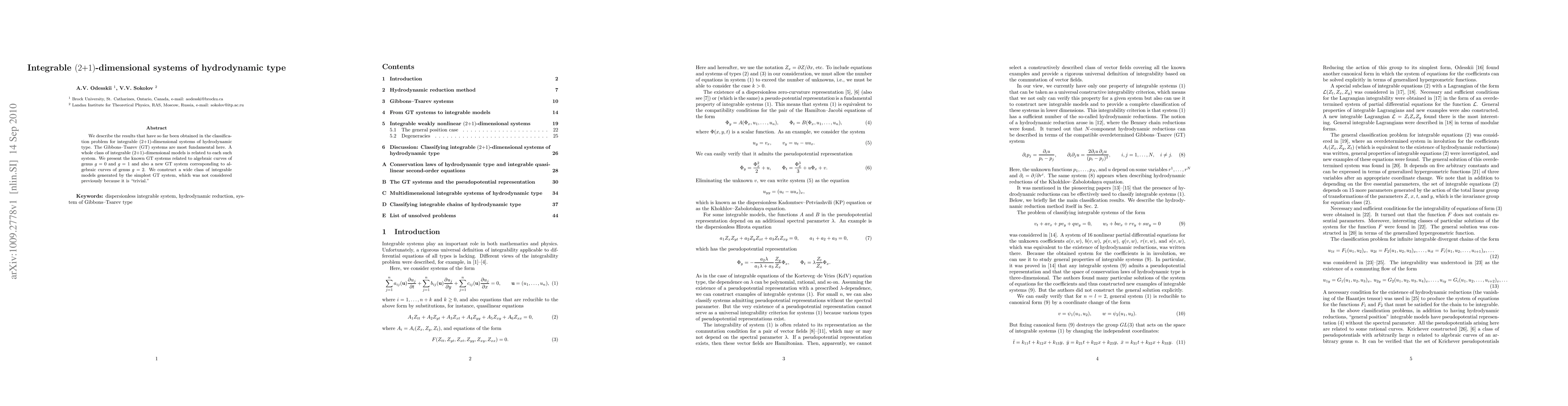 This paper classifies integrable (2+1)-dimensional hydrodynamic systems, focusing on Gibbons-Tsarev (GT) types. It introduces new GT systems for algebraic curves of genus g=2 and constructs a broad class of models from a previously trivial GT system.