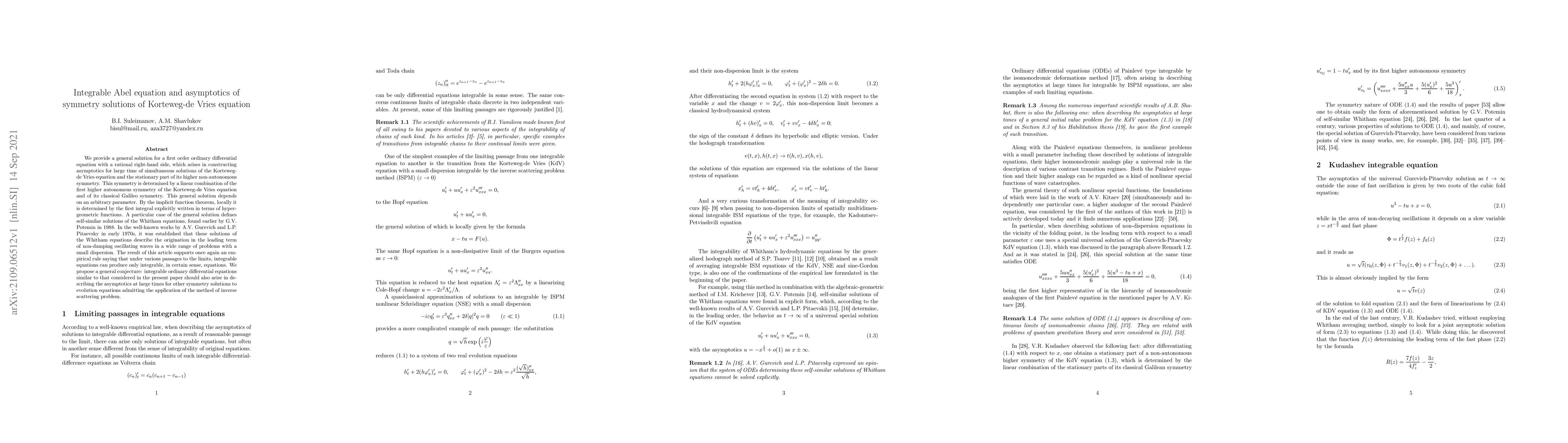 We provide a general solution for a first order ordinary differential equation with a rational right-hand side, which arises in constructing asymptotics for large time of simultaneous solutions of the Korteweg-de Vries equation and the stationary part of its higher non-autonomous symmetry. This symmetry is determined by a linear combination of the first higher autonomous symmetry of the Korteweg-de Vries equation and of its classical Galileo symmetry. This general solution depends on an arbitrary parameter. By the implicit function theorem, locally it is determined by the first integral explicitly written in terms of hypergeometric functions. A particular case of the general solution defines self-similar solutions of the Whitham equations, found earlier by G.V. Potemin in 1988. In the well-known works by A.V. Gurevich and L.P. Pitaevsky in early 1970s, it was established that these solutions of the Whitham equations describe the origination in the leading term of non-damping oscillating waves in a wide range of problems with a small dispersion. The result of this article supports once again an empirical rule saying that under various passages to the limits, integrable equations can produce only integrable, in certain sense, equations. We propose a general conjecture: integrable ordinary differential equations similar to that considered in the present paper should also arise in describing the asymptotics at large times for other symmetry solutions to evolution equations admitting the application of the method of inverse scattering problem.