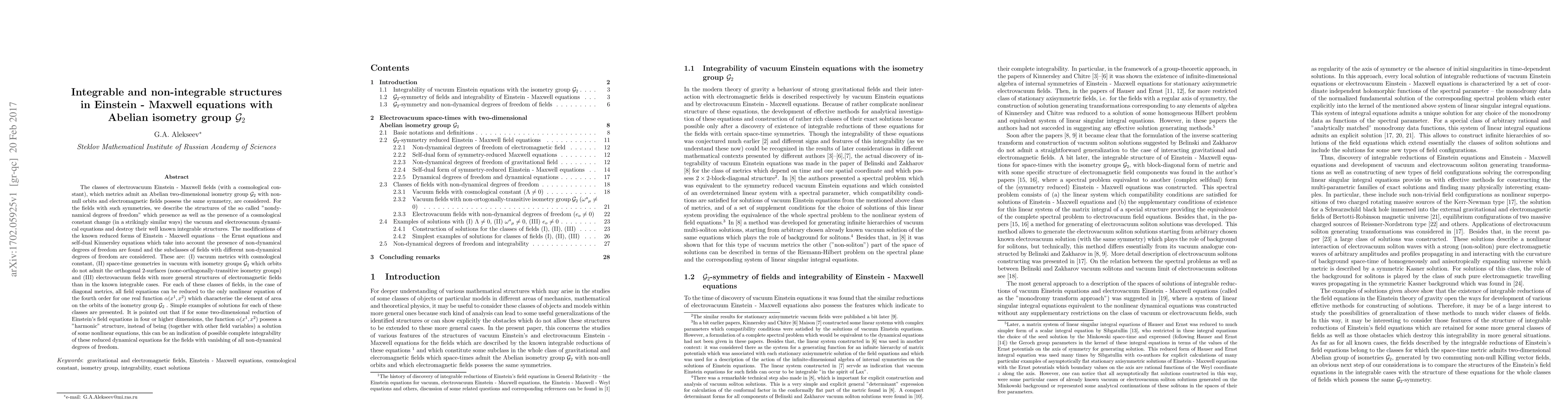 Researchers investigate Einstein-Maxwell fields with Abelian 2D isometry group $ extcal{G}_2$ and find that non-dynamical degrees of freedom destroy known integrable structures, but certain modifications lead to reduced equations that can be solved using a single nonlinear equation.