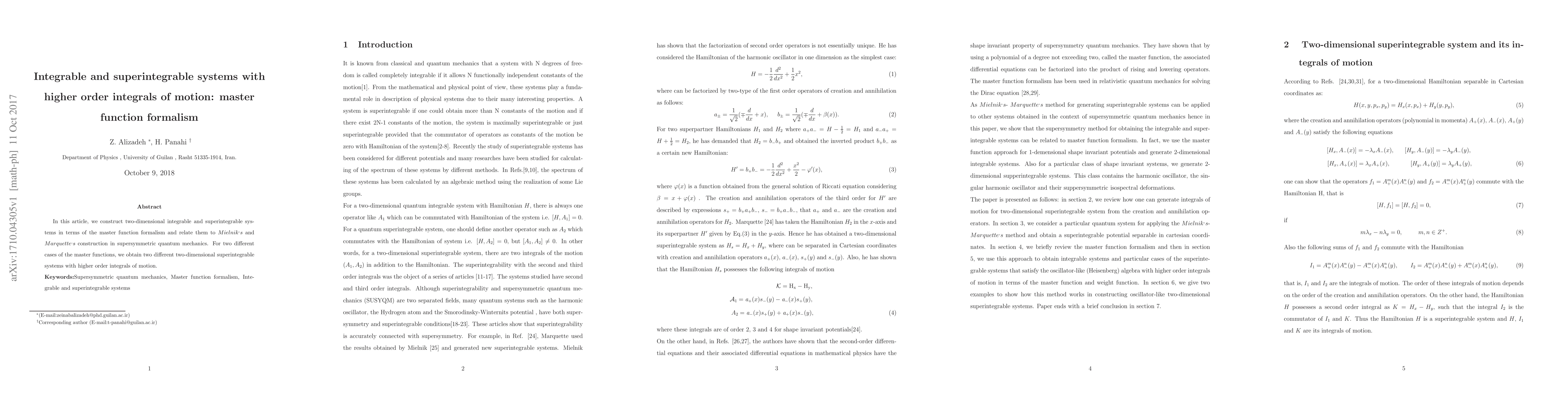 This paper constructs two-dimensional integrable and superintegrable systems using the master function formalism, relating them to constructions in supersymmetric quantum mechanics. It identifies two distinct cases of master functions leading to different two-dimensional superintegrable systems with higher-order integrals of motion.