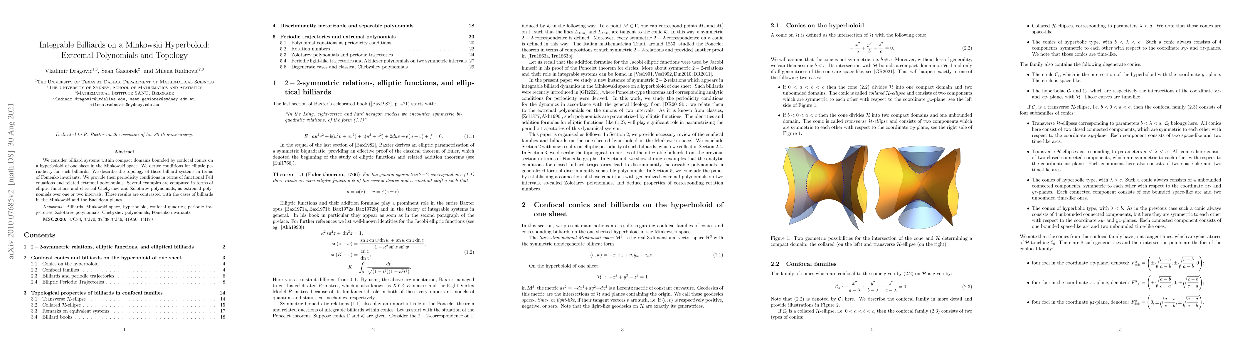 We consider billiard systems within compact domains bounded by confocal conics on a hyperboloid of one sheet in the Minkowski space. We derive conditions for elliptic periodicity for such billiards. We describe the topology of those billiard systems in terms of Fomenko invariants. We provide then periodicity conditions in terms of functional Pell equations and related extremal polynomials. Several examples are computed in terms of elliptic functions and classical Chebyshev and Zolotarev polynomials, as extremal polynomials over one or two intervals. These results are contrasted with the cases of billiards in the Minkowski and the Euclidean planes.