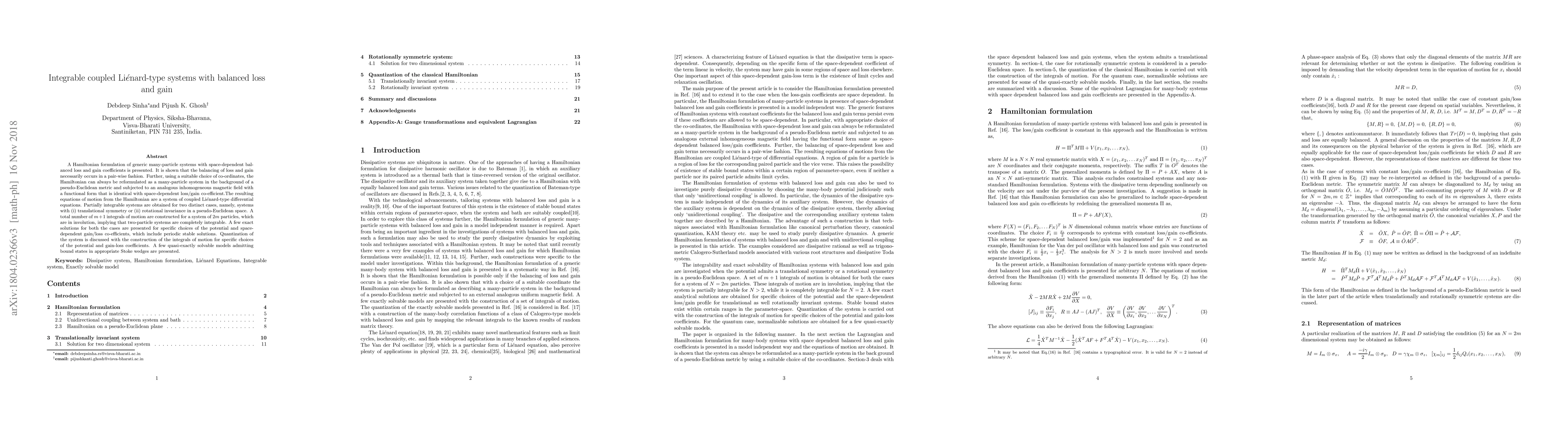 This paper presents a Hamiltonian formulation for many-particle systems with balanced loss and gain, showing that integrable coupled Liénard-type differential equations arise under specific symmetries. It constructs $m+1$ integrals of motion for $2m$ particles, demonstrating complete integrability for two-particle systems and presenting exact solutions and quasi-exactly solvable models.