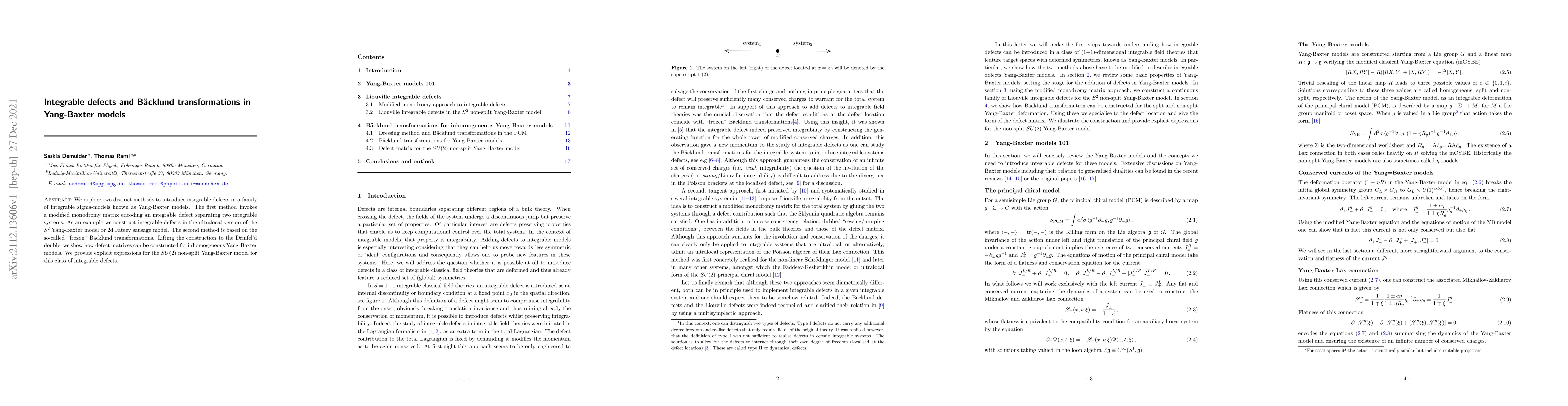 This paper investigates two approaches to introduce integrable defects in Yang-Baxter models, employing modified monodromy matrices and "frozen" Bäcklund transformations, and demonstrates their application through the construction of defects in the ultralocal $S^2$ model and explicit expressions for the $SU(2)$ non-split Yang-Baxter model.