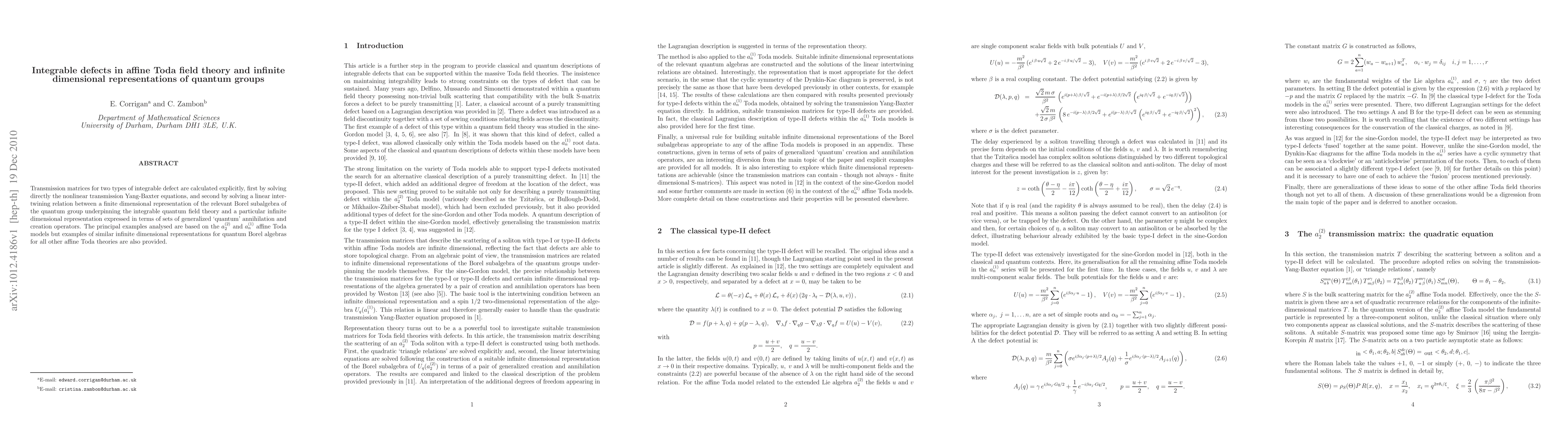 Transmission matrices for two types of integrable defect are calculated explicitly, first by solving directly the nonlinear transmission Yang-Baxter equations, and second by solving a linear intertwining relation between a finite dimensional representation of the relevant Borel subalgebra of the quantum group underpinning the integrable quantum field theory and a particular infinite dimensional representation expressed in terms of sets of generalized `quantum' annihilation and creation operators. The principal examples analysed are based on the $a_2^{(2)}$ and $a_n^{(1)}$ affine Toda models but examples of similar infinite dimensional representations for quantum Borel algebras for all other affine Toda theories are also provided.