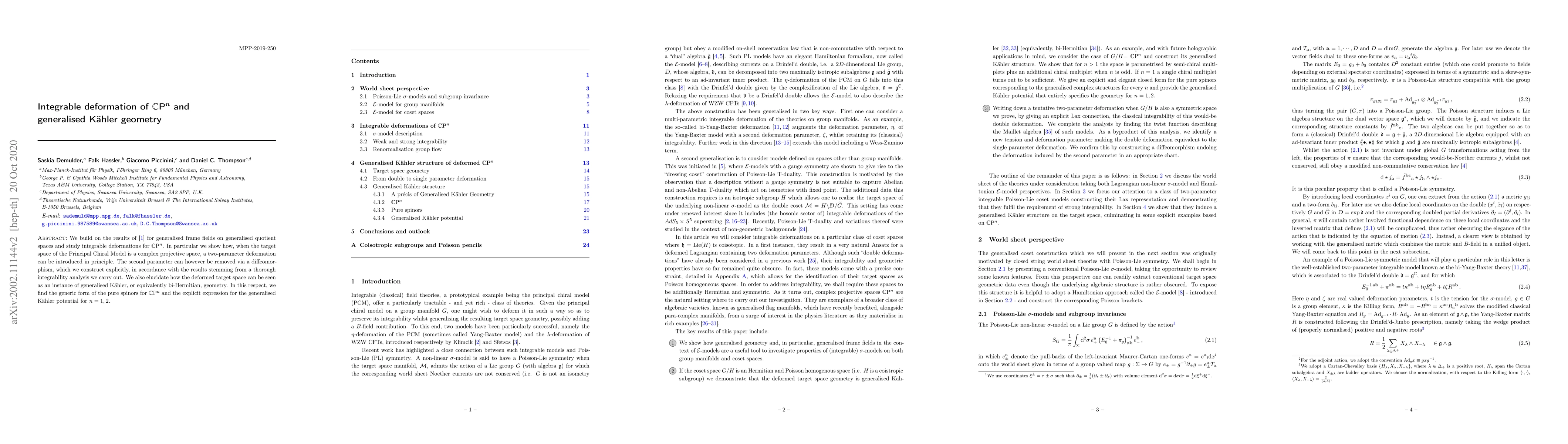 We build on the results of arXiv:1912.11036 for generalised frame fields on generalised quotient spaces and study integrable deformations for $\mathbb{CP}^n$. In particular we show how, when the target space of the Principal Chiral Model is a complex projective space, a two-parameter deformation can be introduced in principle. The second parameter can however be removed via a diffeomorphism, which we construct explicitly, in accordance with the results stemming from a thorough integrability analysis we carry out. We also elucidate how the deformed target space can be seen as an instance of generalised Kaehler, or equivalently bi-Hermitian, geometry. In this respect, we find the generic form of the pure spinors for $\mathbb{CP}^n$ and the explicit expression for the generalised Kaehler potential for $n=1,2$.