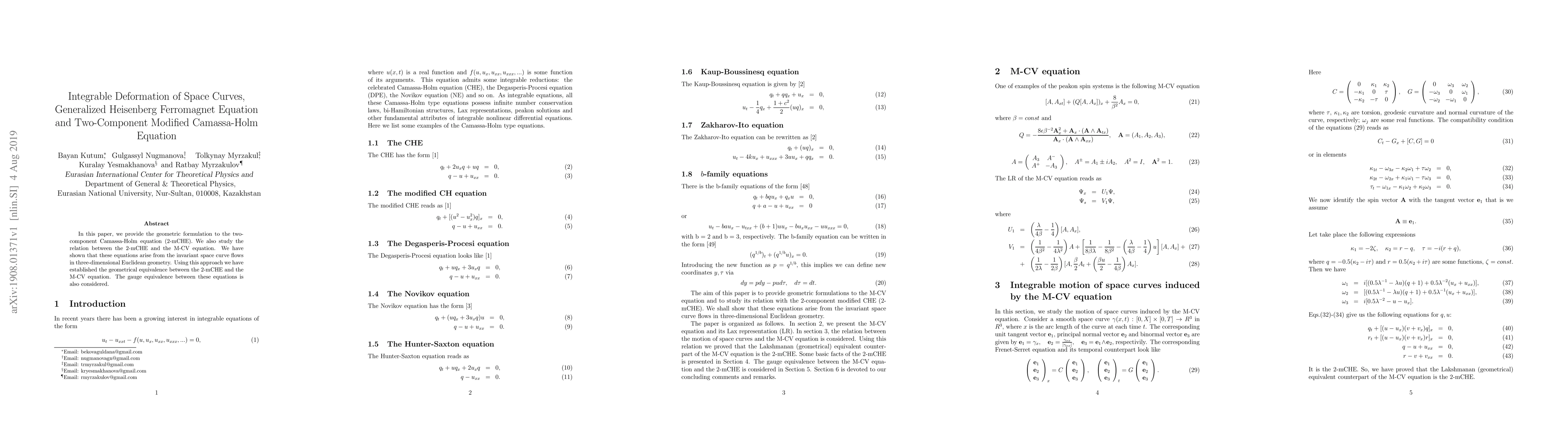 In this paper, we provide the geometric formulation to the two-component Camassa-Holm equation (2-mCHE). We also study the relation between the 2-mCHE and the M-CV equation. We have shown that these equations arise from the invariant space curve flows in three-dimensional Euclidean geometry. Using this approach we have established the geometrical equivalence between the 2-mCHE and the M-CV equation. The gauge equivalence between these equations is also considered.