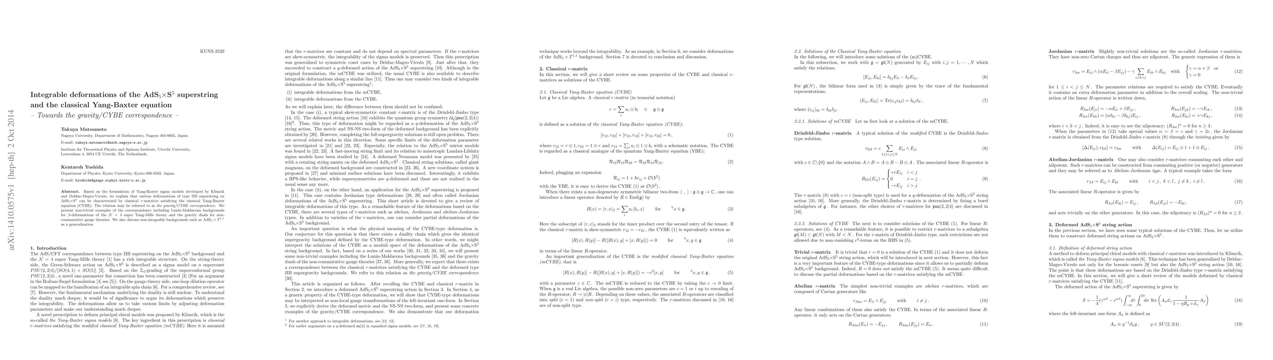 Two-line summary: This paper explores how integrable deformations of the AdS$_5\times$S$^5$ superstring can be characterized by classical $r$-matrices satisfying the classical Yang-Baxter equation (CYBE), establishing a `gravity/CYBE correspondence'. It provides examples involving Lunin-Maldacena backgrounds and discusses non-integrable backgrounds like AdS$_5\times T^{1,1}$.