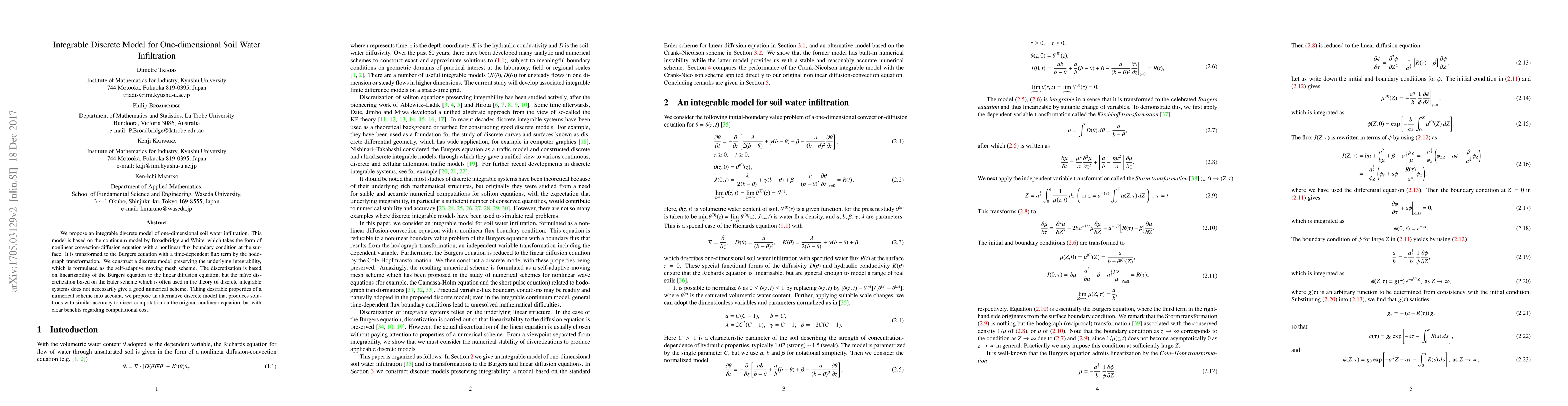 This paper proposes an integrable discrete model for one-dimensional soil water infiltration based on the continuum model by Broadbridge and White. The authors transform the model into a Burgers equation and develop a self-adaptive moving mesh scheme that maintains integrability, offering a more efficient numerical scheme than traditional Euler methods.