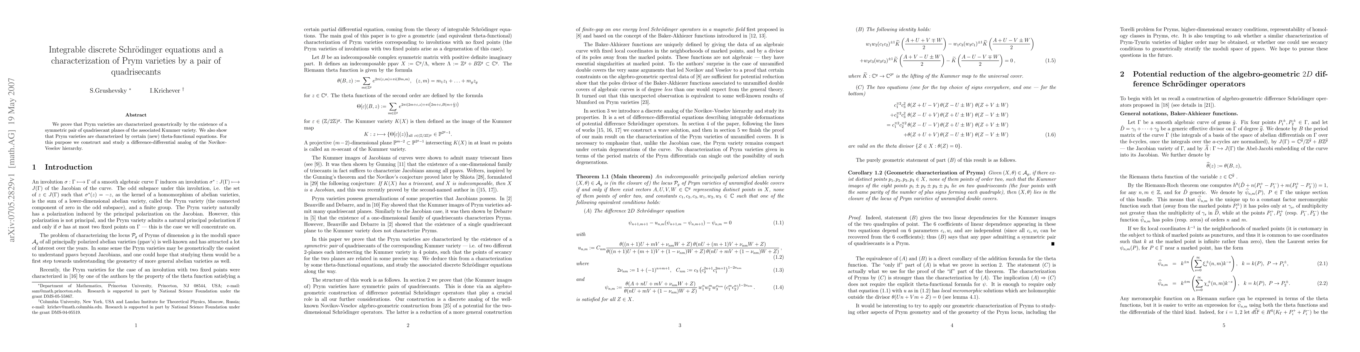 This paper establishes that Prym varieties are geometrically characterized by a symmetric pair of quadrisecant planes of their associated Kummer variety, and introduces new theta-functional equations for their characterization. It constructs an integrable discrete Schrödinger equation to study a difference-differential analog of the Novikov-Veselov hierarchy.