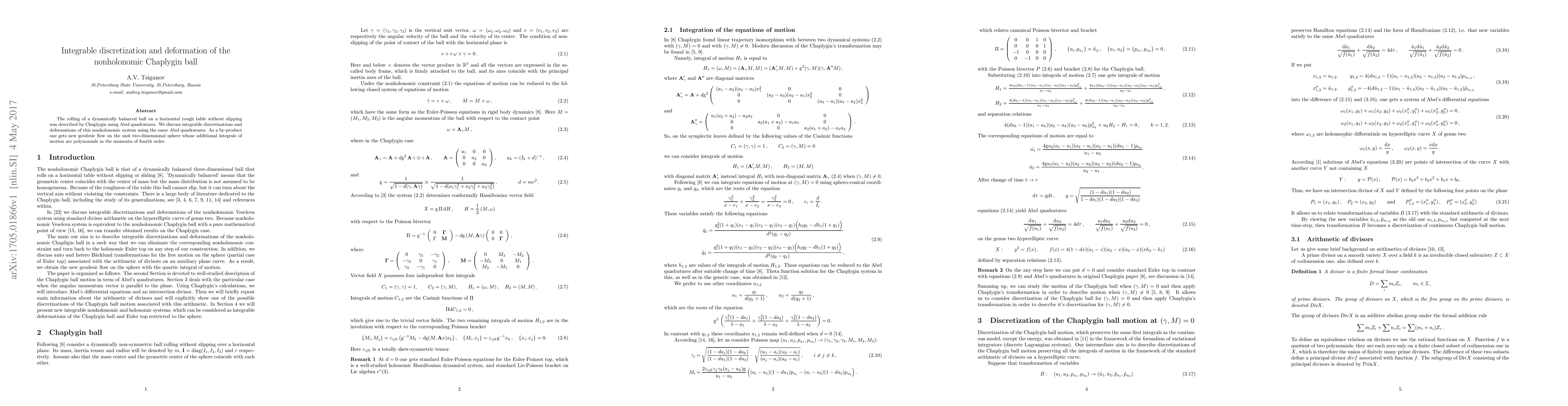 This paper explores integrable discretizations and deformations of the nonholonomic Chaplygin ball system, revealing new geodesic flows on the unit sphere with fourth-order polynomial integrals of motion derived from Abel quadratures.