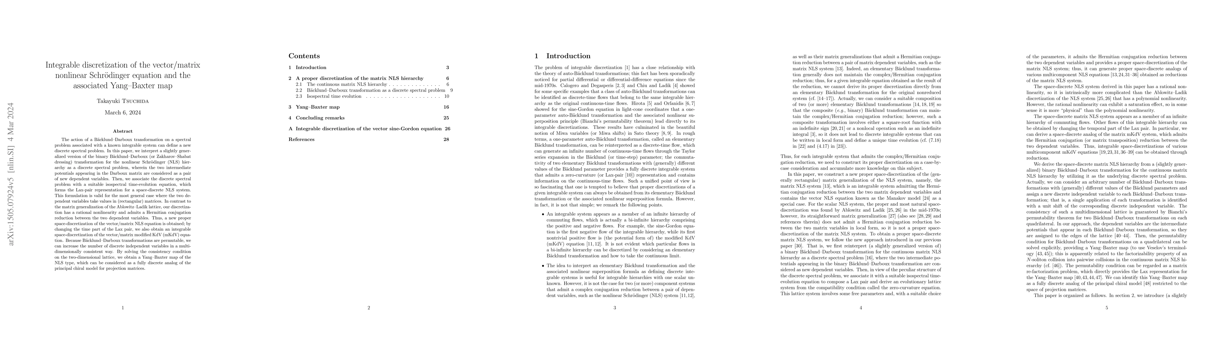 This paper proposes a new integrable discretization of the vector/matrix nonlinear Schrödinger equation using a generalized Bäcklund-Darboux transformation, leading to a Lax-pair representation and rational nonlinearity. It also introduces a Yang-Baxter map, providing a fully discrete analog of the principal chiral model for projection matrices.