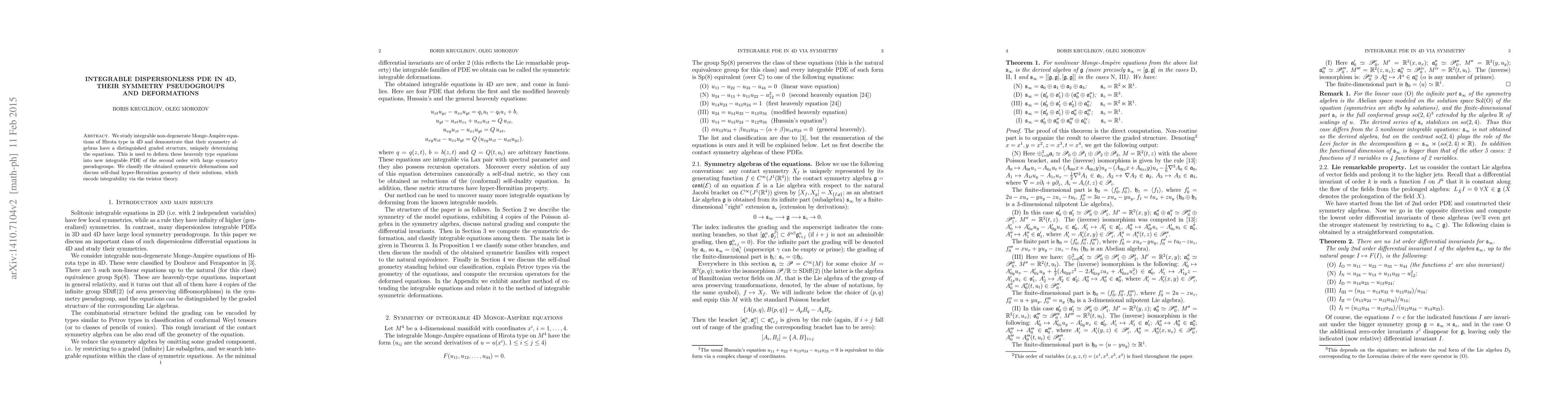 This paper investigates integrable dispersionless partial differential equations (PDEs) in 4D, revealing a graded structure in their symmetry algebras that uniquely identifies them. The study also explores deformations of these equations into new integrable second-order PDEs with extensive symmetry, classifying these deformations and linking their solutions to self-dual hyper-Hermitian geometry through twistor theory.