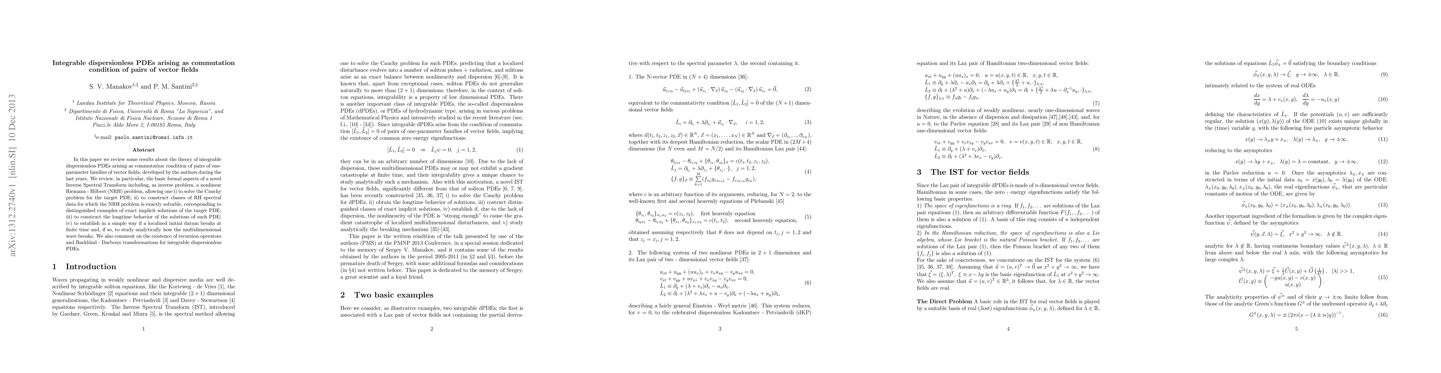 This paper reviews the development of integrable dispersionless PDEs from commutation conditions of vector fields, focusing on a novel Inverse Spectral Transform that solves the Cauchy problem, constructs solvable spectral data, analyzes long-term behavior, and determines finite-time breaking of localized initial data. It also discusses recursion operators and Backlund-Darboux transformations for these PDEs.