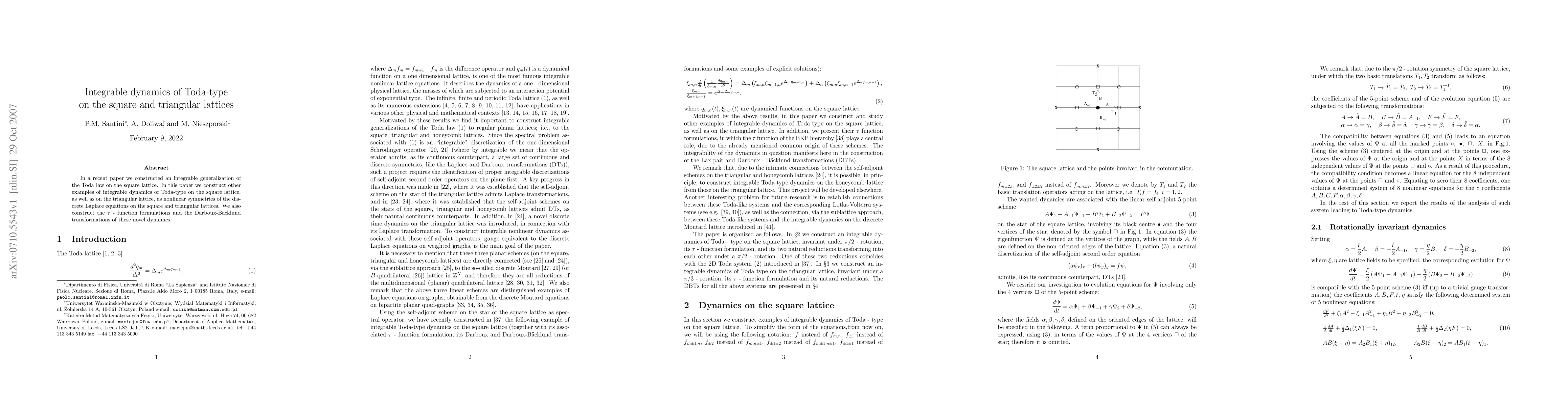 This paper extends integrable Toda-type dynamics to the triangular lattice, alongside the square lattice, identifying nonlinear symmetries in discrete Laplace equations. It also introduces $\tau$-function formulations and Darboux-Bäcklund transformations for these new dynamics.