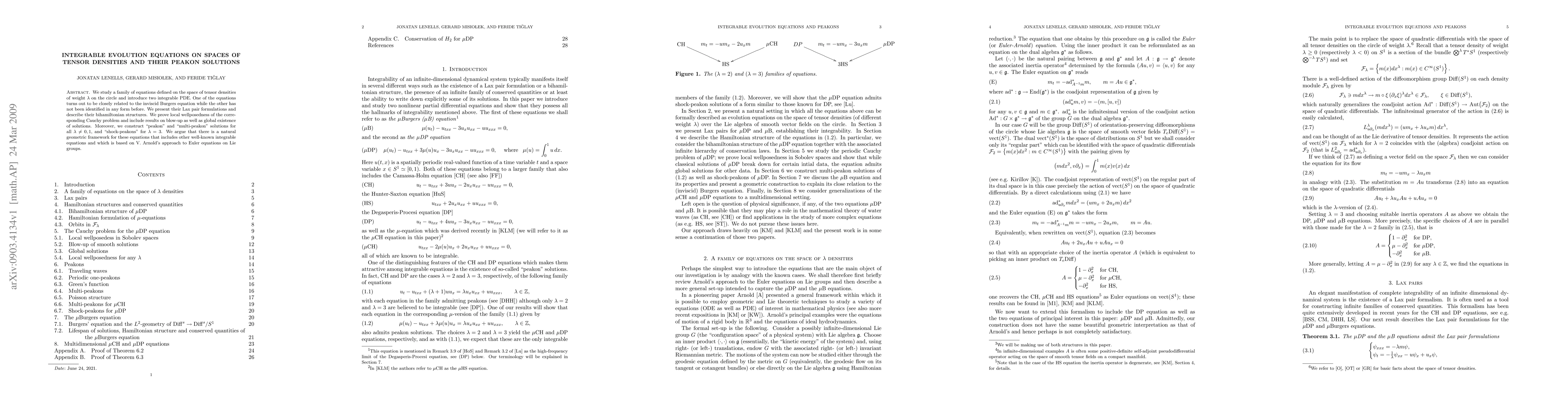 We study a family of equations defined on the space of tensor densities of weight $\lambda$ on the circle and introduce two integrable PDE. One of the equations turns out to be closely related to the inviscid Burgers equation while the other has not been identified in any form before. We present their Lax pair formulations and describe their bihamiltonian structures. We prove local wellposedness of the corresponding Cauchy problem and include results on blow-up as well as global existence of solutions. Moreover, we construct "peakon" and "multi-peakon" solutions for all $\lambda \neq 0,1$, and "shock-peakons" for $\lambda = 3$. We argue that there is a natural geometric framework for these equations that includes other well-known integrable equations and which is based on V. Arnold's approach to Euler equations on Lie groups.