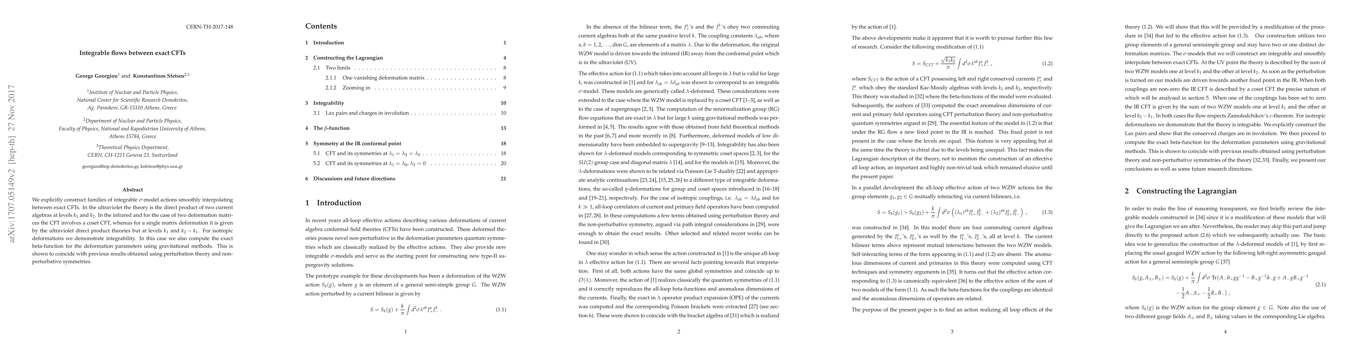 This paper constructs integrable $\sigma$-model actions that interpolate between exact conformal field theories (CFTs) in the ultraviolet and infrared limits. It demonstrates integrability for isotropic deformations and computes the exact beta-function, matching previous results from perturbation theory and non-perturbative symmetries.