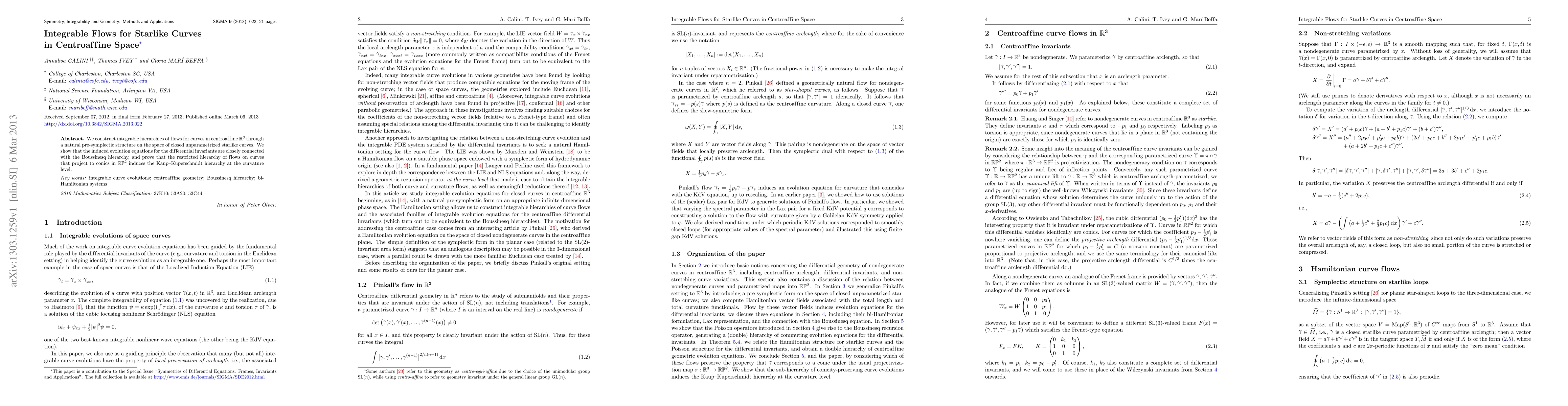 The research constructs integrable hierarchies of flows for starlike curves in centroaffine ${\mathbb R}^3$ using a natural pre-symplectic structure on the space of closed unparametrized starlike curves, connecting the evolution equations for differential invariants to the Boussinesq hierarchy and proving that restricted flows on curves projecting to conics in ${\mathbb{RP}}^2$ induce the Kaup-Kuperschmidt hierarchy at the curvature level.