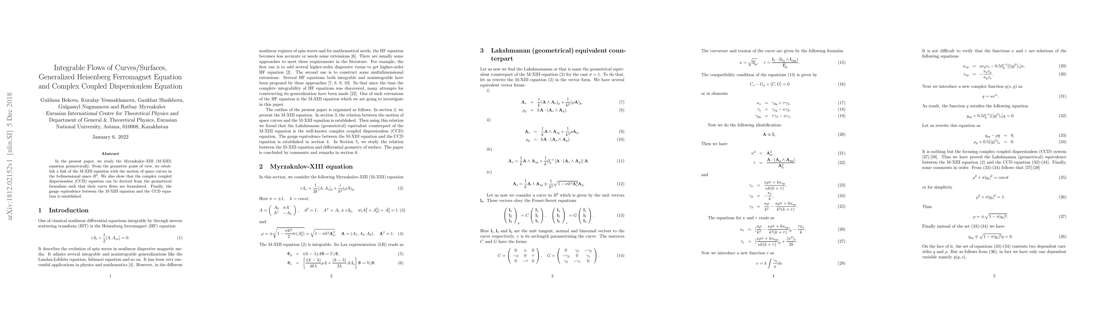 This paper explores the Myrzakulov-XIII (M-XIII) equation geometrically, linking it to the motion of 3D space curves. It also derives the Complex Coupled Dispersionless (CCD) equation from this formalism, establishing a gauge equivalence between the M-XIII and CCD equations.